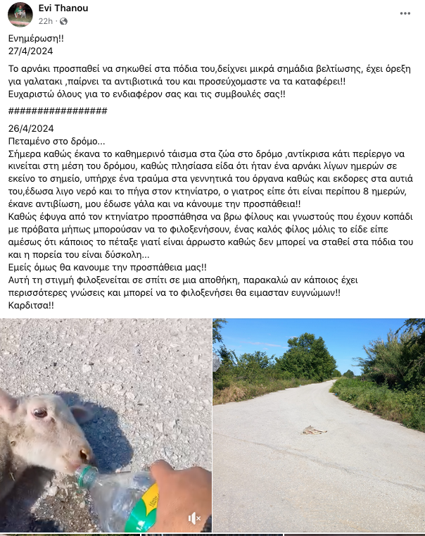 Τότε πλησίασε και κατάλαβε ότι ήταν ένα αρνάκι. «Υπήρχε ένα τραύμα στα γεννητικά του όργανα καθώς και εκδορές στα αυτιά του, του έδωσα λίγο νερό και το πήγα στον κτηνίατρο», αναφέρει.