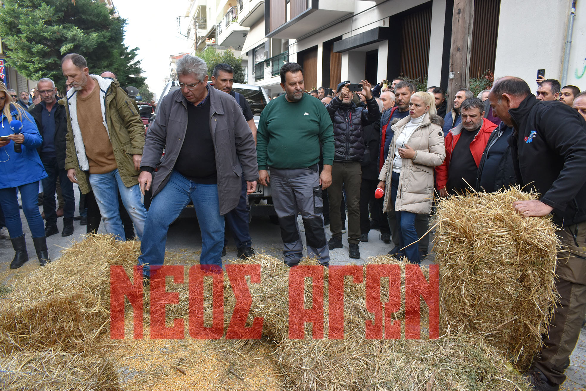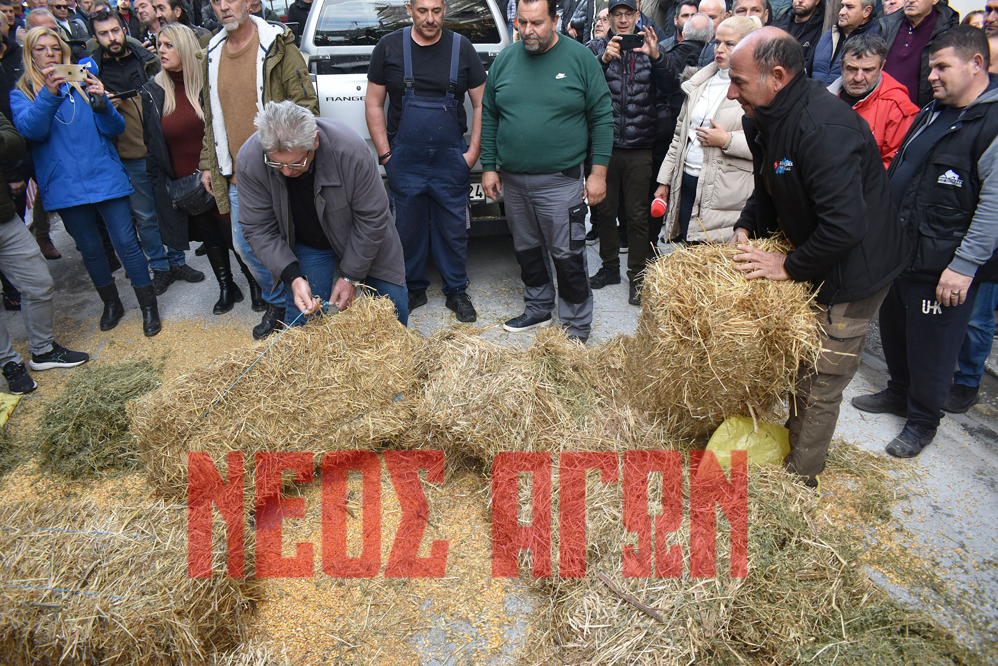 Στο πλαίσιο των αποφάσεων που έλαβαν κατά τη διάρκεια της σύσκεψης του μπλόκου το βράδυ της Κυριακής, μετέβησαν μαζί με περίπου 20 τρακτέρ έξω από το γραφείο του Υπουργού όπου ως ένδειξη διαμαρτυρίας για τις χαμηλές τιμές στα προϊόντα και την πολιτική που εφαρμόζει η κυβέρνηση πέταξαν στο δρόμο συμβολικά μπάλες με άχυρο, τριφύλλι και σακιά με καλαμπόκι.