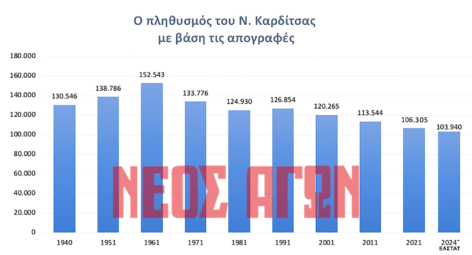 Να θυμίσουμε ότι με βάση τα αποτελέσματα της απογραφή του πληθυσμού που διενεργήθηκε το 2021 και δημοσιεύτηκε σε ΦΕΚ, ο πληθυσμός στο Ν. Καρδίτσας ανέρχονταν σε 106.305.