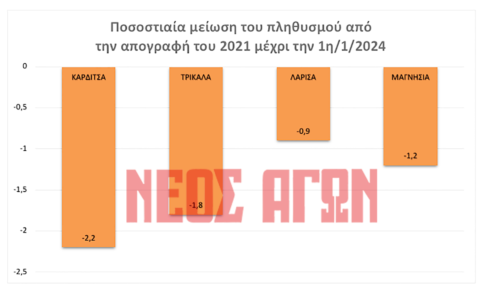 Μείωση καταγράφεται στο σύνολο του Θεσσαλικού επιπέδου την 1η Ιανουαρίου του 2024 σε σύγκριση με την απογραφή. Σύμφωνα με τα τελευταία στοιχεία της ΕΛΣΤΑΤ ο πληθυσμός της Θεσσαλίας εκτιμήθηκε την πρώτη Γενάρη του περυσινού έτους στα 678.747 άτομα, όταν στην απογραφή του 2021 ήταν 688.255, μείωση της τάξης του 1,3%. Η μεγαλύτερη συρρίκνωση σε επίπεδο Θεσσαλίας καταγράφεται στο Ν. Καρδίτσας.