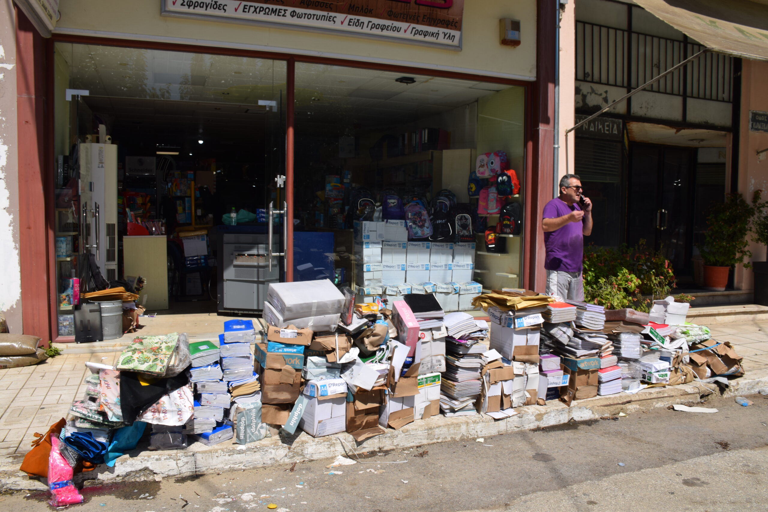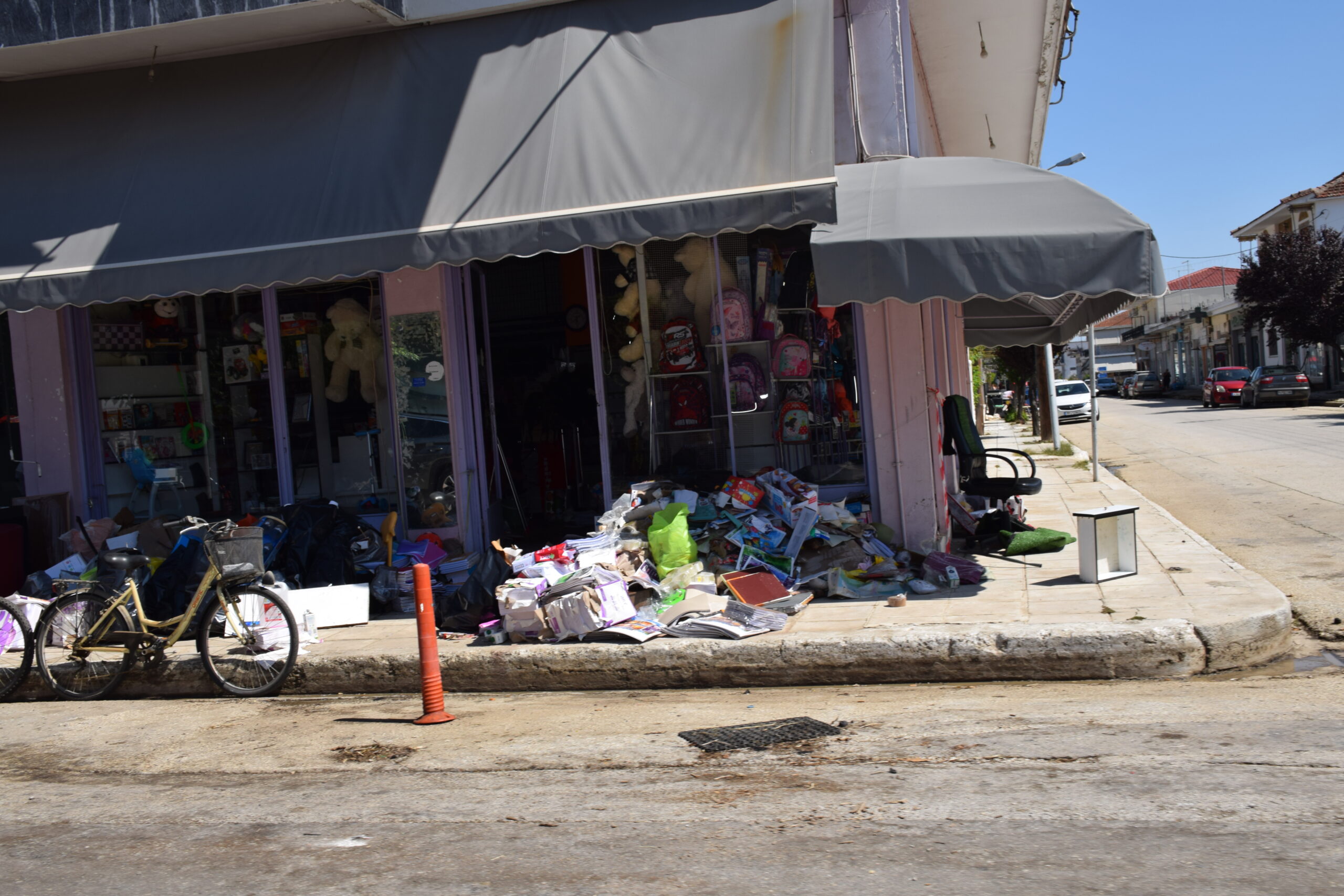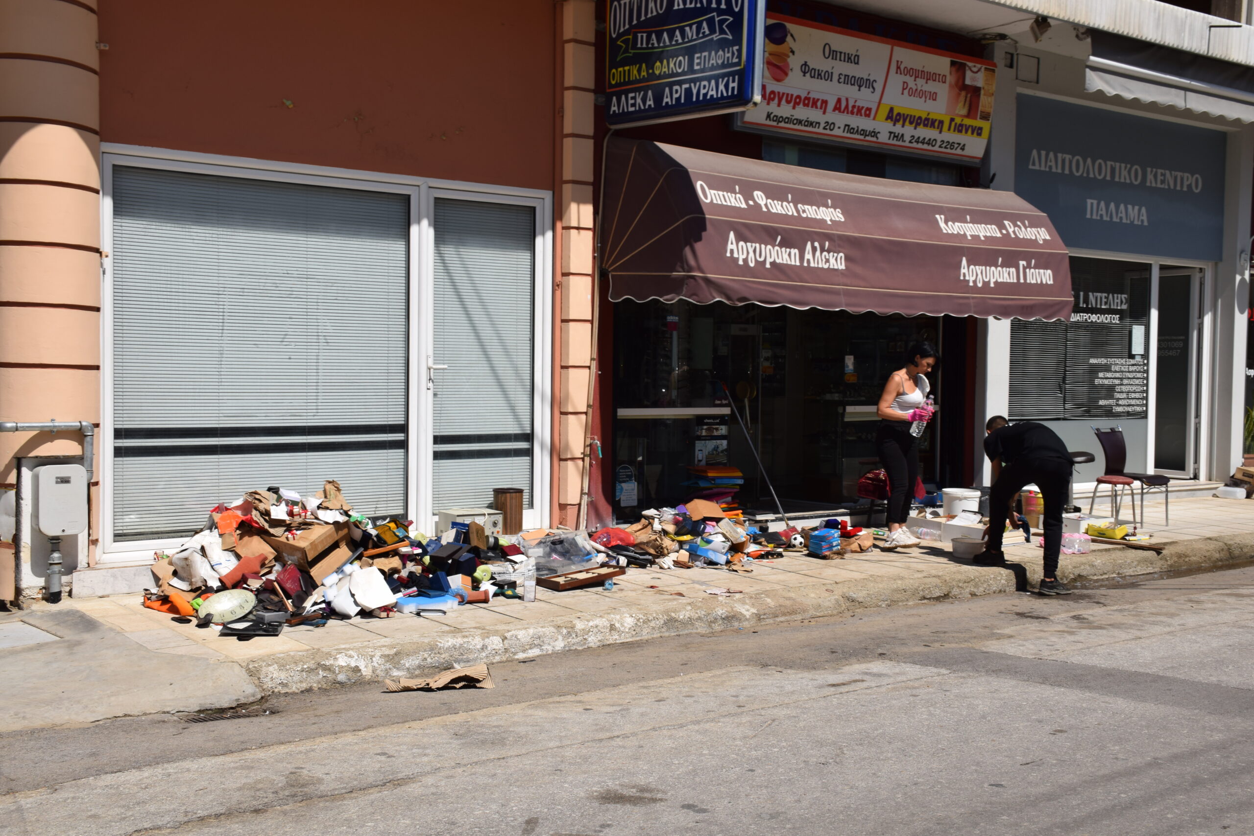 Τα σπίτια όλα ανοιχτά για να ξεβρομίσουν, όλα τα υπάρχοντα τους στοιβαγμένα έξω στο πεζοδρόμιο και στις αυλές. Όμοια εικόνα και στην αγορά του Παλαμά, που οι επαγγελματίες προσπαθούν να βγάλουν τη λάσπη από τα καταστήματα, με τα κατεστραμμένα έπιπλα και εμπορεύματα να έχουν στοιβαχτεί στην άκρη του δρόμου. Κι όλα αυτά χωρίς νερό.