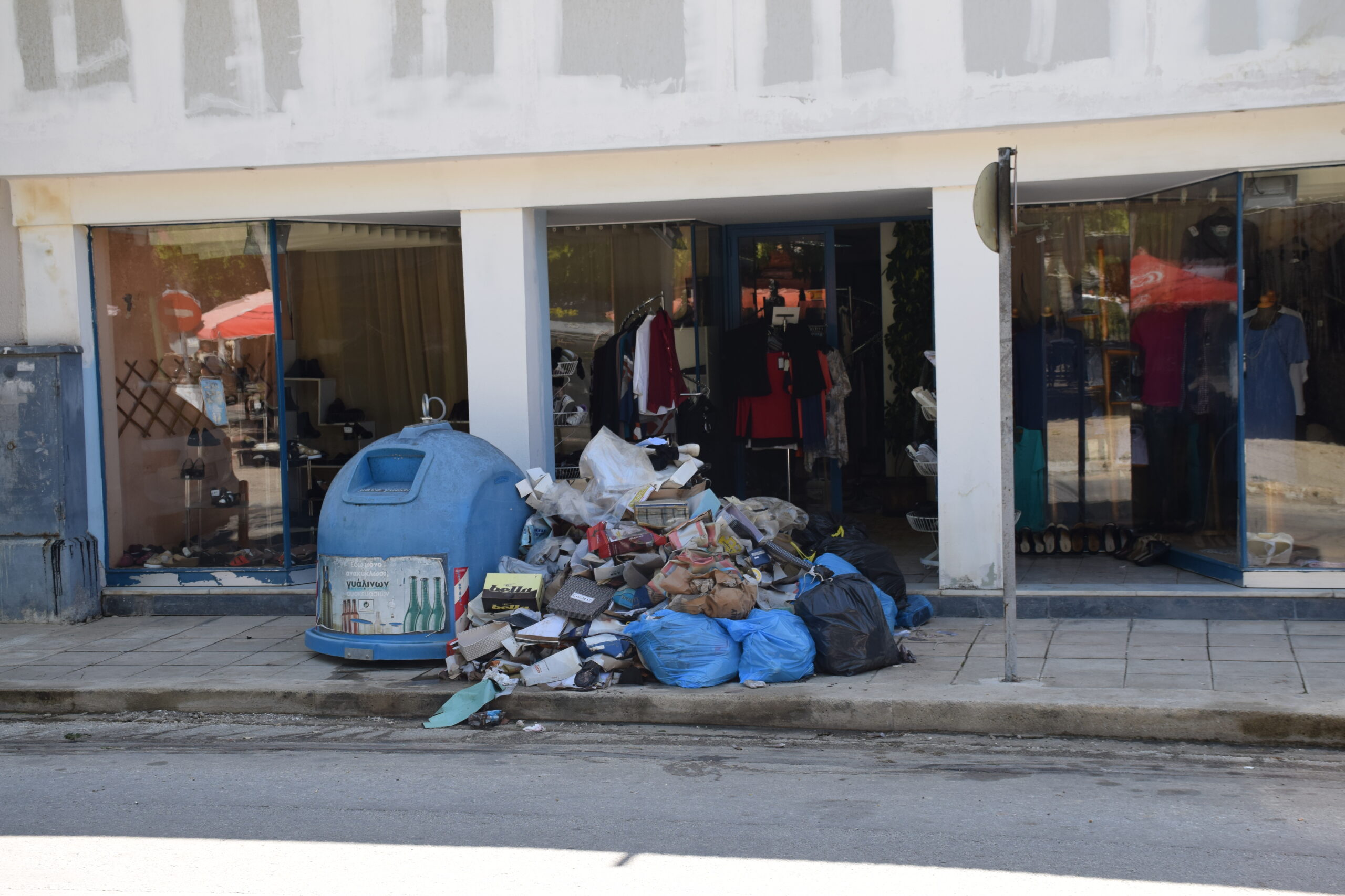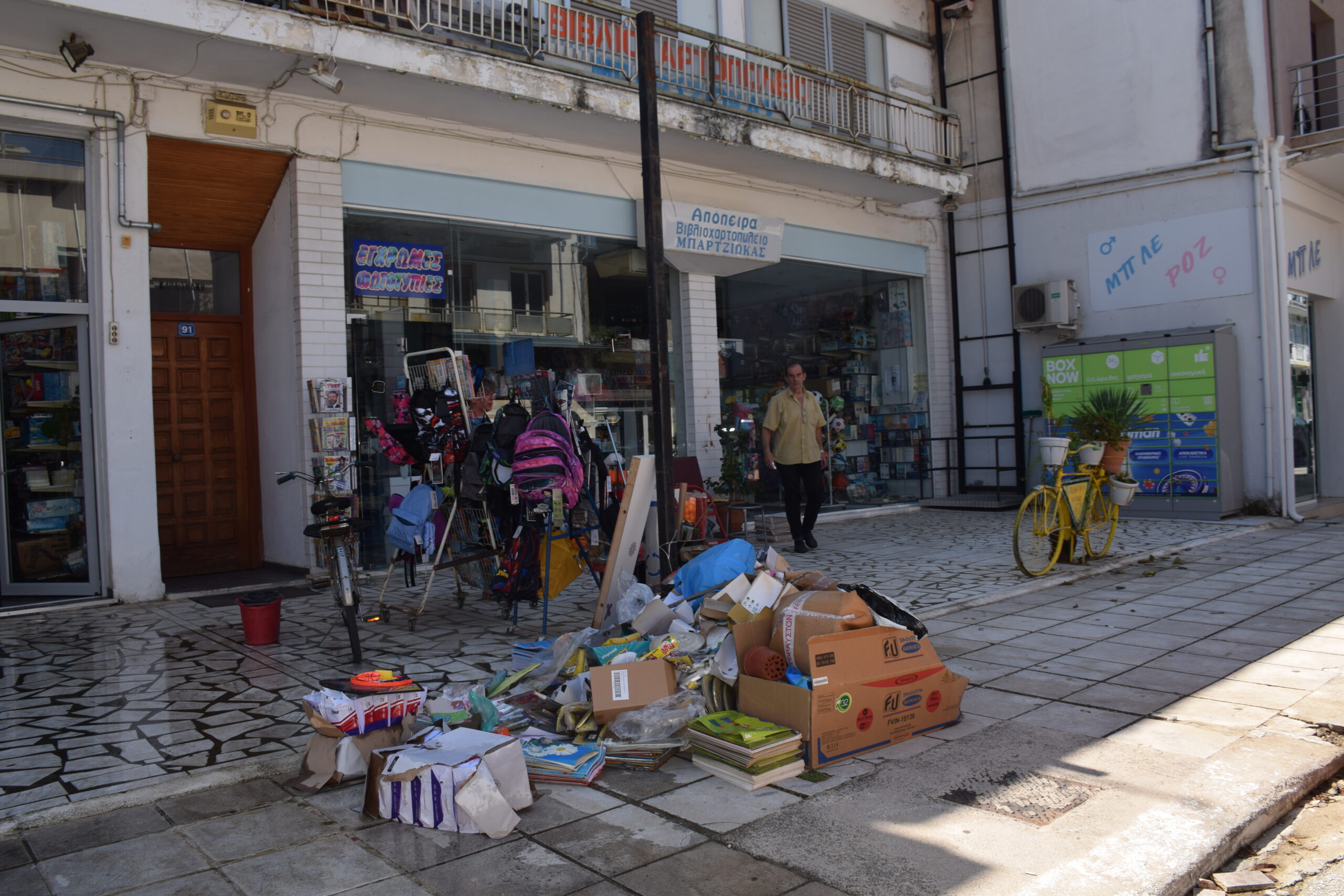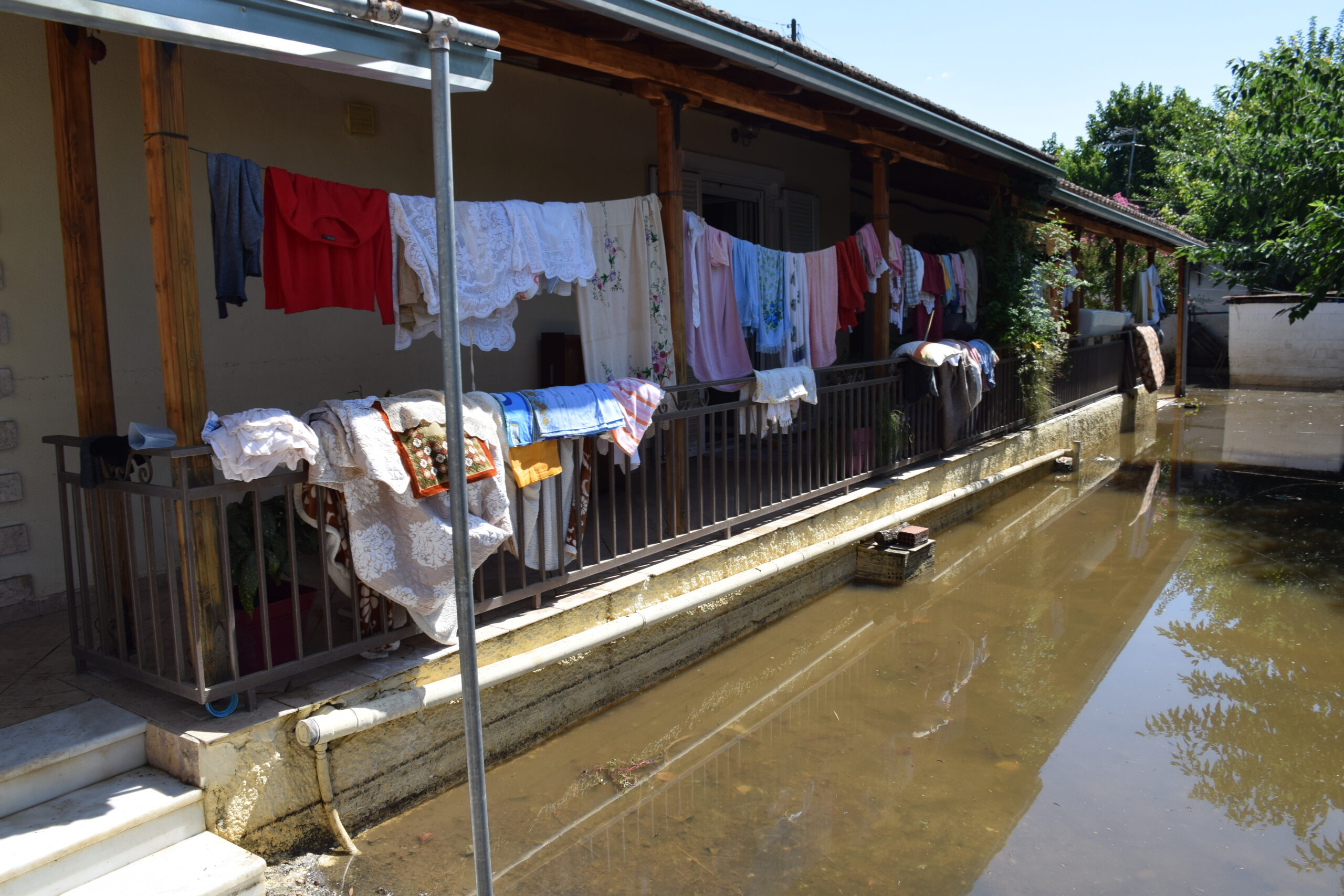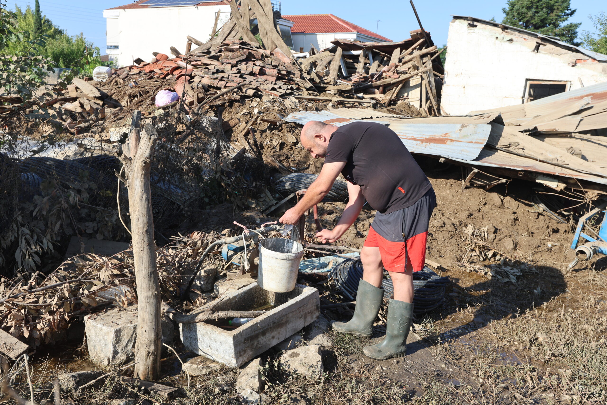 Τα σπίτια όλα ανοιχτά για να ξεβρομίσουν, όλα τα υπάρχοντα τους στοιβαγμένα έξω στο πεζοδρόμιο και στις αυλές. Όμοια εικόνα και στην αγορά του Παλαμά, που οι επαγγελματίες προσπαθούν να βγάλουν τη λάσπη από τα καταστήματα, με τα κατεστραμμένα έπιπλα και εμπορεύματα να έχουν στοιβαχτεί στην άκρη του δρόμου. Κι όλα αυτά χωρίς νερό.