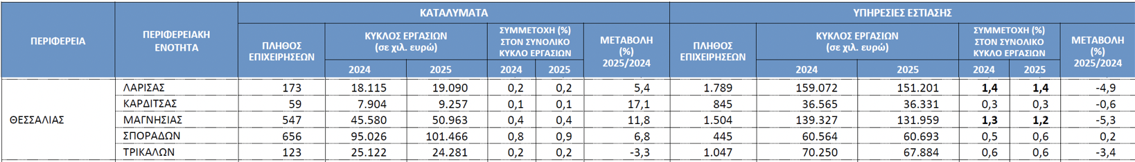 Ενώ σε εθνικό επίπεδο ο κλάδος των καταλυμάτων σημείωσε άνοδο 3,3%, στην Καρδίτσα κατάφερε να υπερβεί κατά πολύ τον μέσο όρο. Αντίθετα, η εστίαση στην περιοχή ακολούθησε την εθνική τάση, με μικρότερες απώλειες σε σχέση με την υπόλοιπη χώρα.