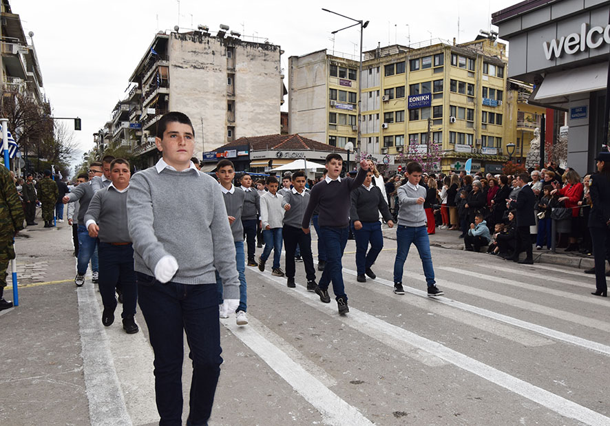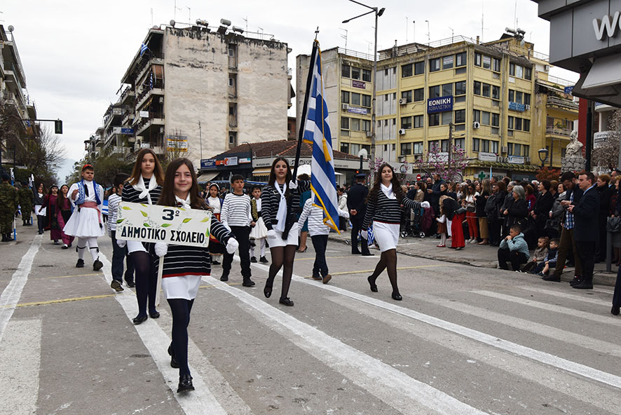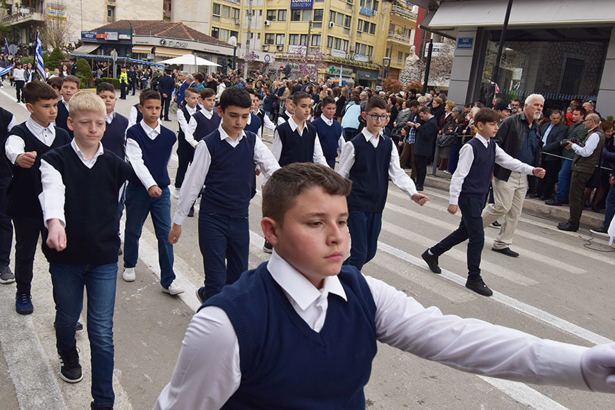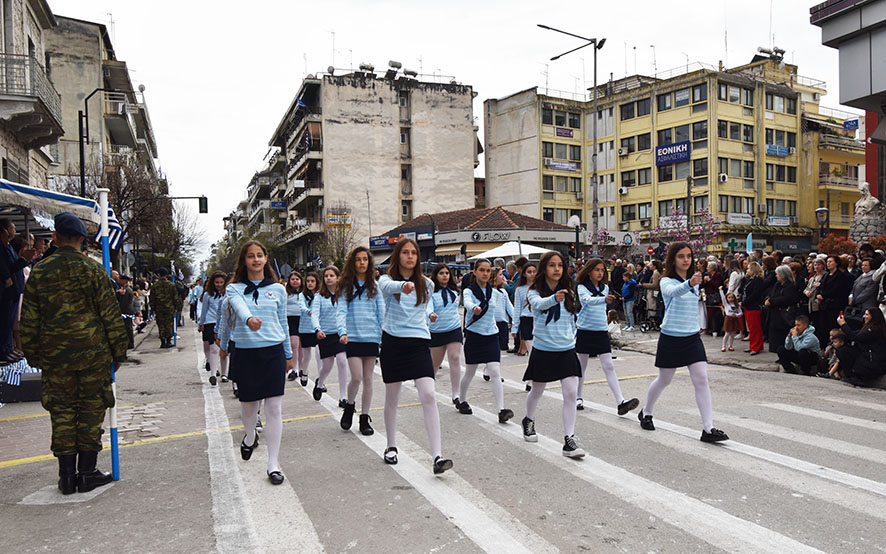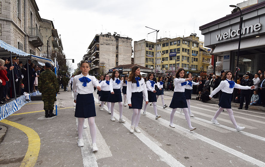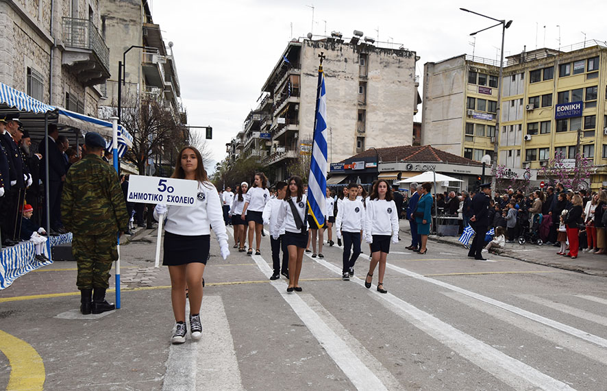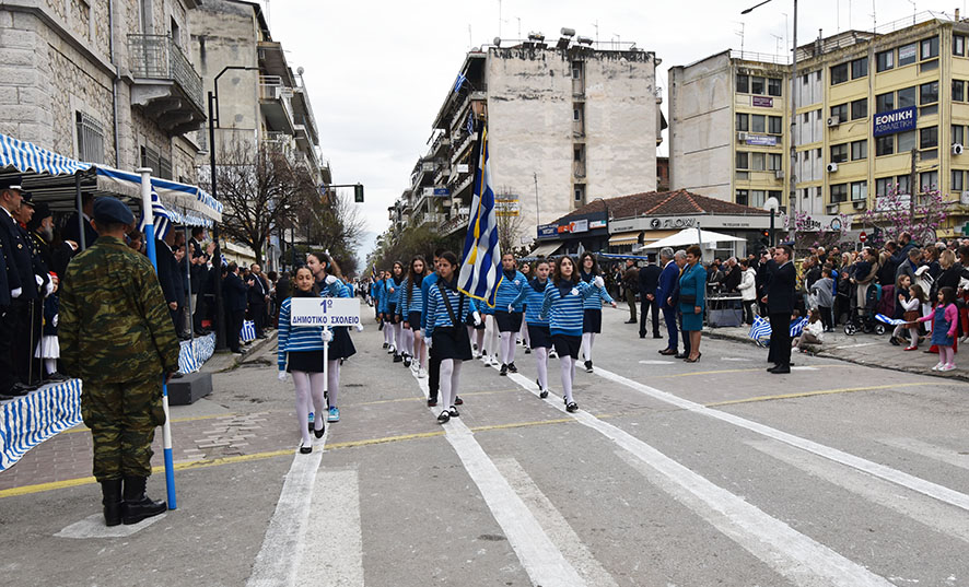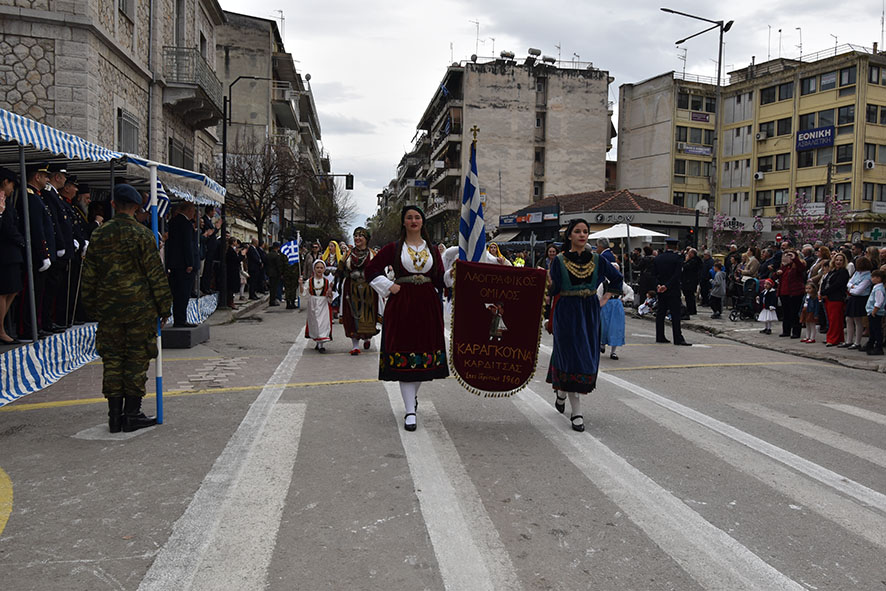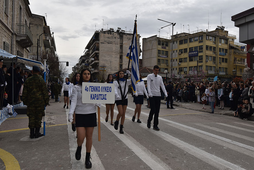Χιλιάδες Καρδιτσιώτες συνέρρευσαν στην οδό Καραϊσκάκη στο κέντρο της πόλης για να καμαρώσουν και να χειροκροτήσουν θερμά τη μαθητιώσσα νεολαία.