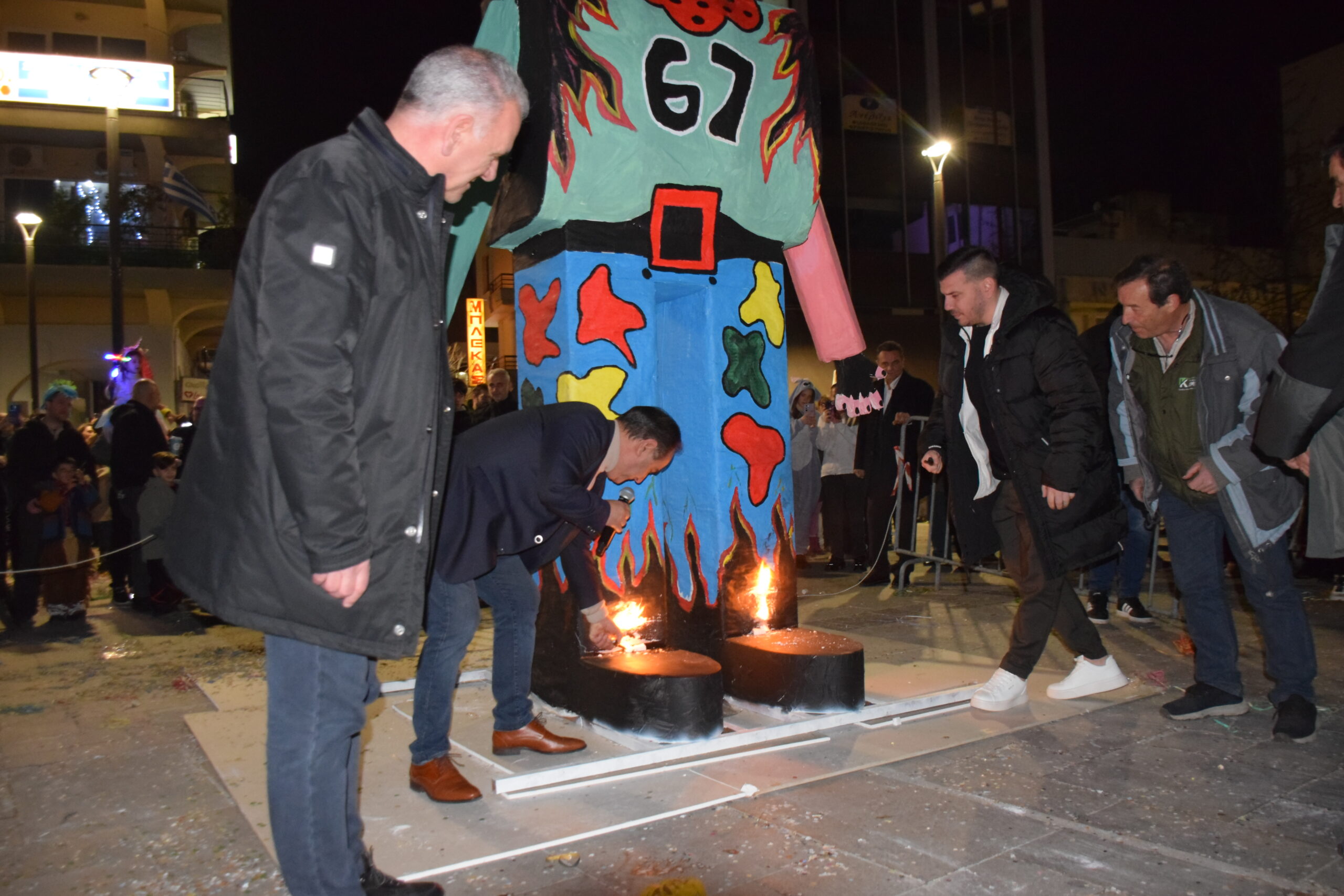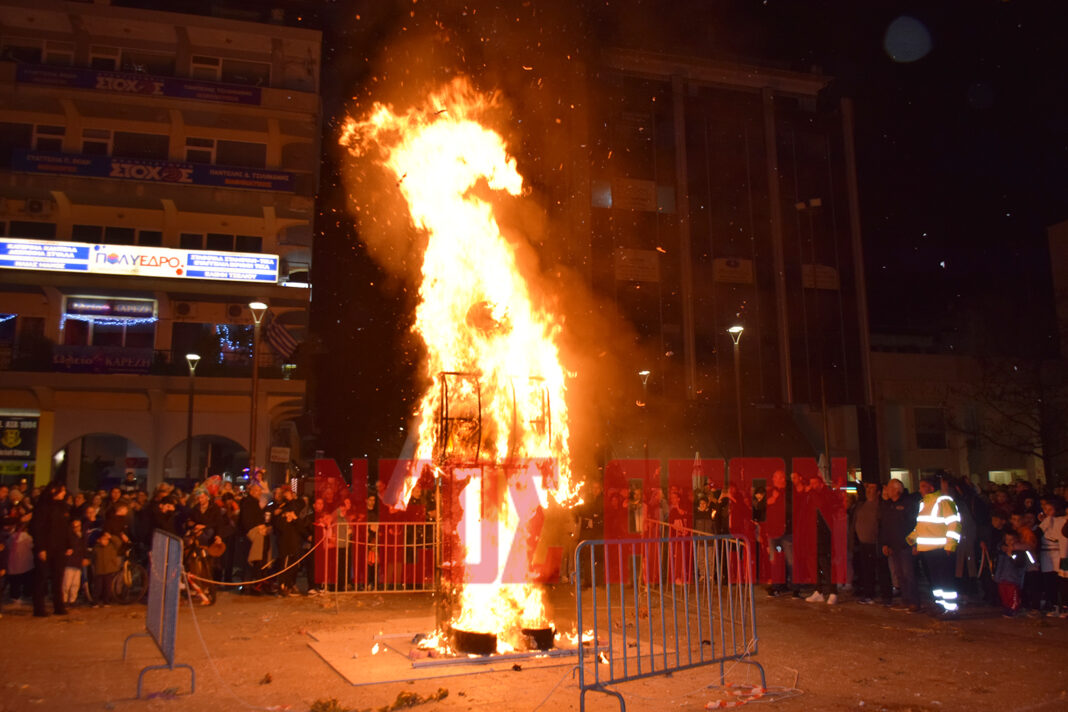 Όταν έφτασε η ώρα της καύσης του βασιλιά Καρνάβαλου όλοι οι παραβρισκόμενοι συγκεντρώθηκαν γύρω από τον χώρο όπου είχε στηθεί το εντυπωσιακό ομοίωμα τηρώντας την απαραίτητη ζώνη ασφαλείας που είχε οριοθετηθεί για να δουν Δήμαρχο κ. Βασ. Τσιάκο να ανάβει τη φωτιά.