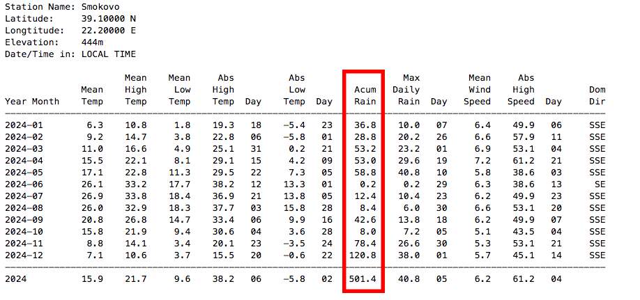 Σύμφωνα με τις μετρήσεις του μετεωρολογικού σταθμού του Εθνικού Αστεροσκοπείου στο Σμόκοβο που καταγράφει ο Νέος Αγών, το Δεκέμβριο έπεσαν περί τα 120 χιλιοστά βροχής και τον Νοέμβριο 78,4 χιλιοστά. Ολόκληρο το 2024 έπεσαν 501 χιλιοστά. Ουσιαστικά σε δύο μήνες έπεσε το 40% της βροχής ολόκληρου έτους (πίνακας).
