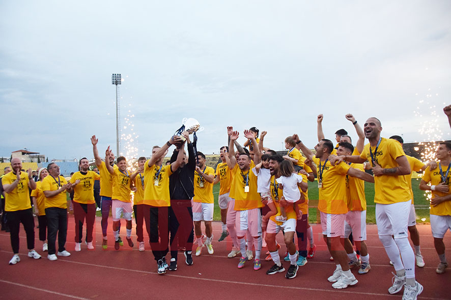 Την παράσταση όμως ακόμη και από τον τελικό έκλεψε η γιορτή που στήθηκε στην εξέδρα και στον αγωνιστικό χώρο για την απονομή του Κυπέλλου για την κατάκτηση του πρωταθλήματος της Γ’ Εθνικής Κατηγορίας που σηματοδοτεί και την επιστροφή στις επαγγελματικές κατηγορίες του Ελληνικού ποδοσφαίρου.