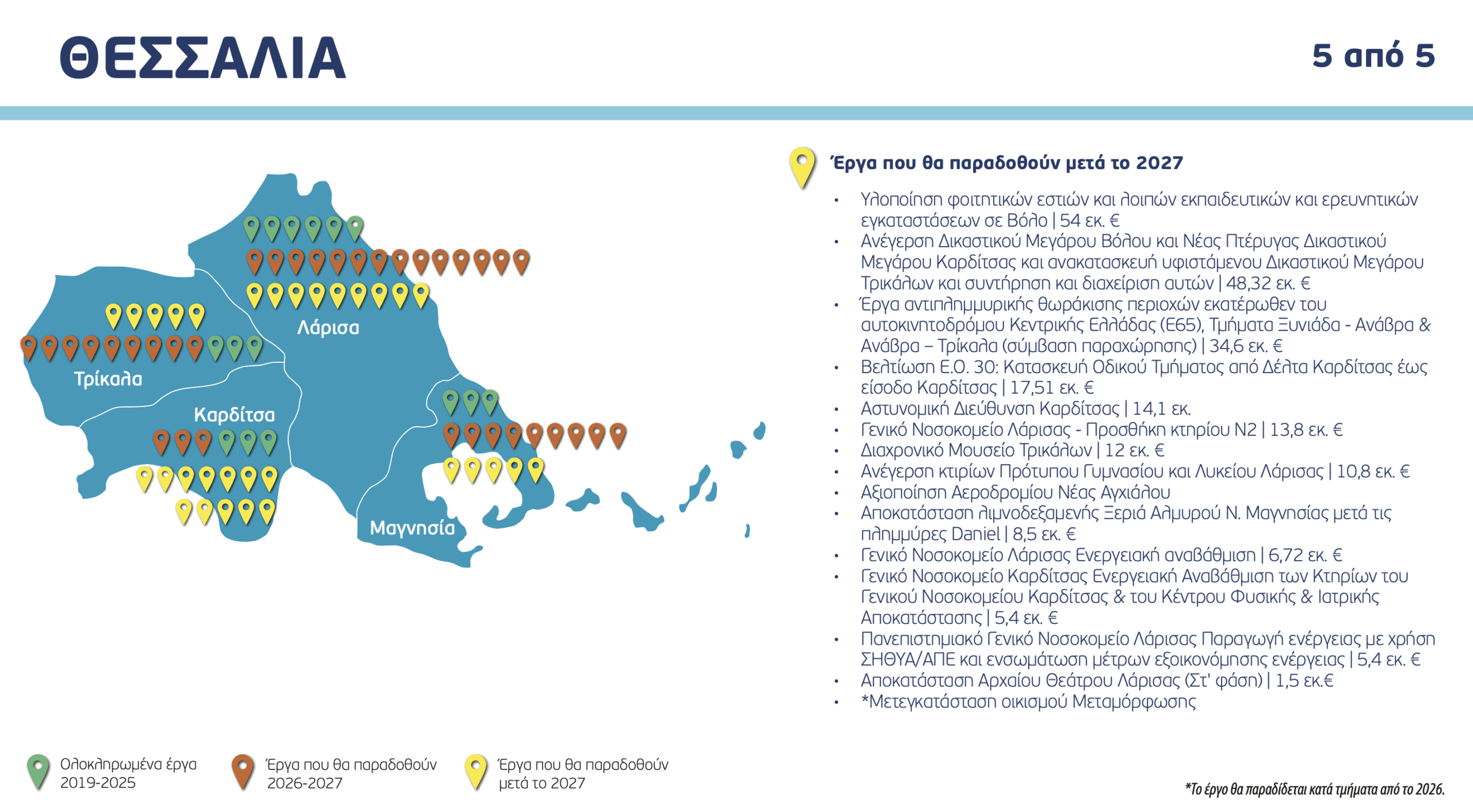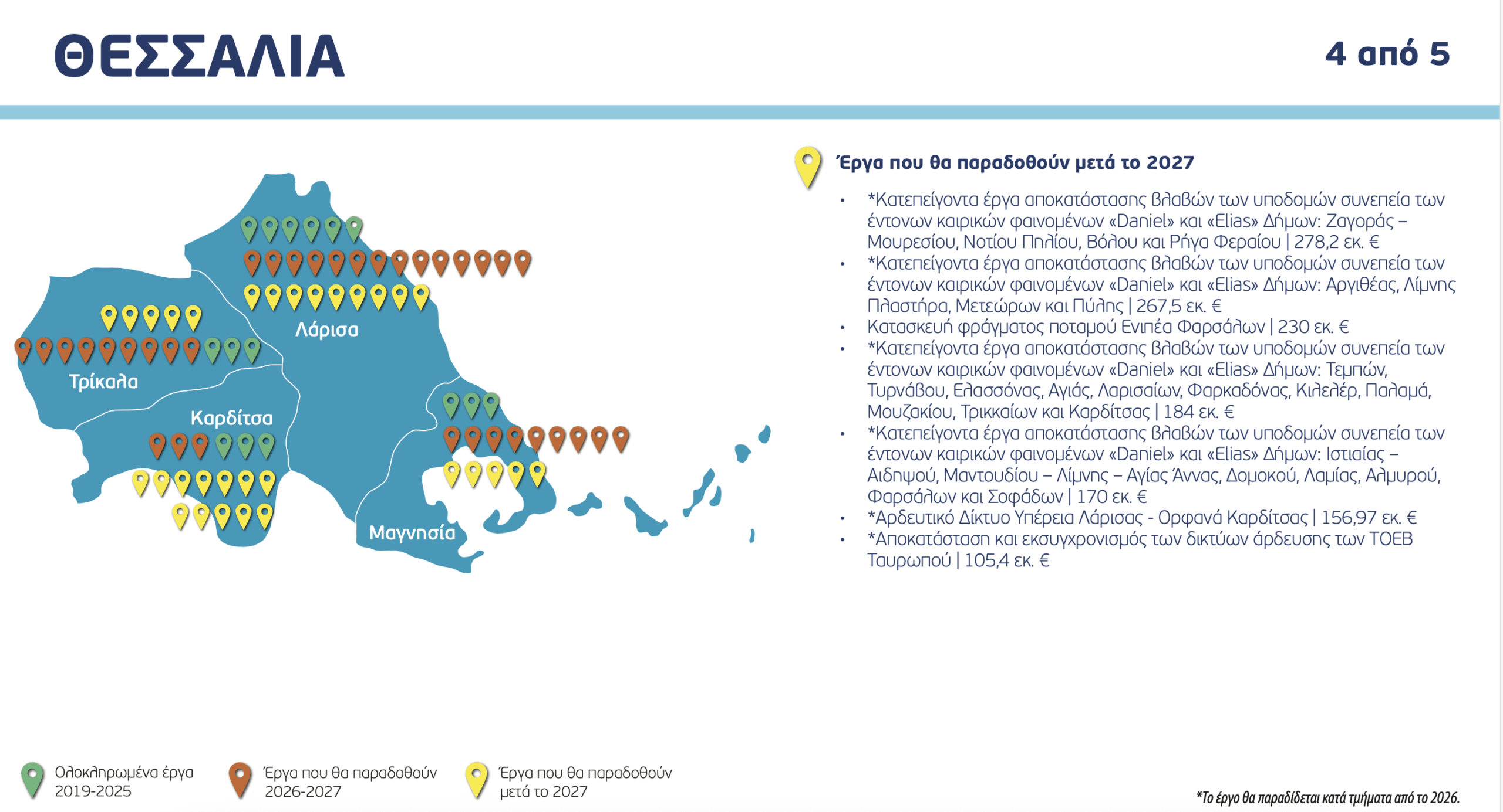 -Κατεπείγοντα έργα αποκατάστασης βλαβών των υποδομών συνεπεία των έντονων καιρικών φαινομένων «Daniel» και «Elias» ∆ήμων: Τεμπών, Τυρνάβου, Ελασσόνας, Αγιάς, Λαρισαίων, Φαρκαδόνας, Κιλελέρ, Παλαμά, Μουζακίου, Τρικκαίων και Καρδίτσας 184 εκ. €
