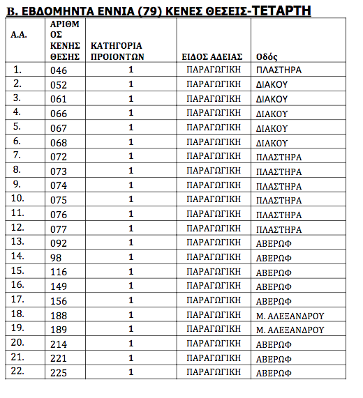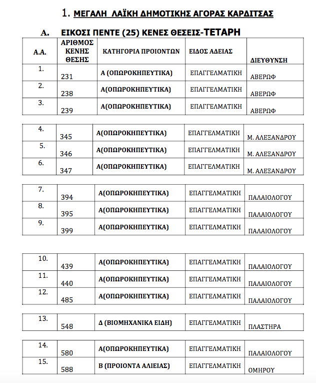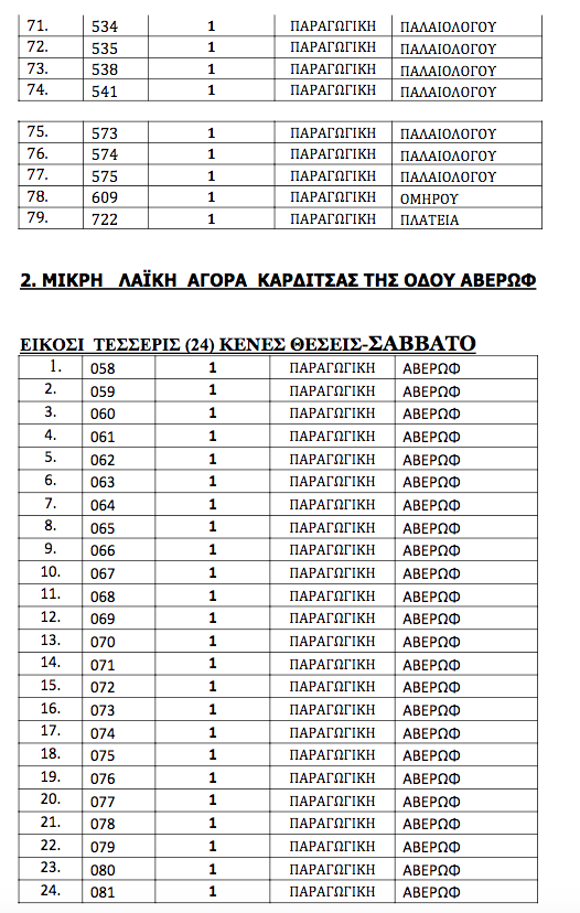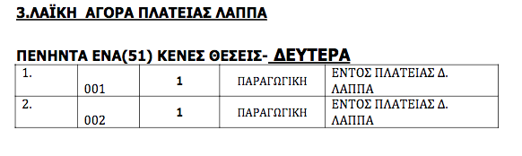 Πρόκειται για 179 θέσεις που αφορούν της λαϊκές αγορές της Δευτέρας, της Τετάρτης και του Σαββάτου.