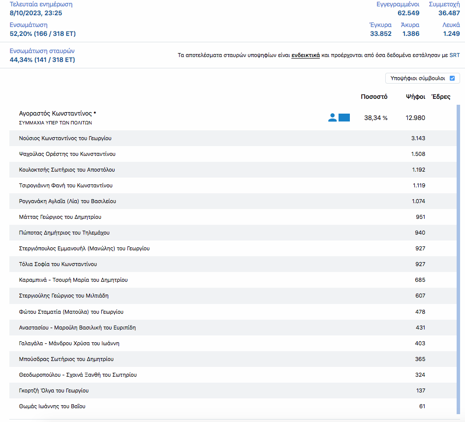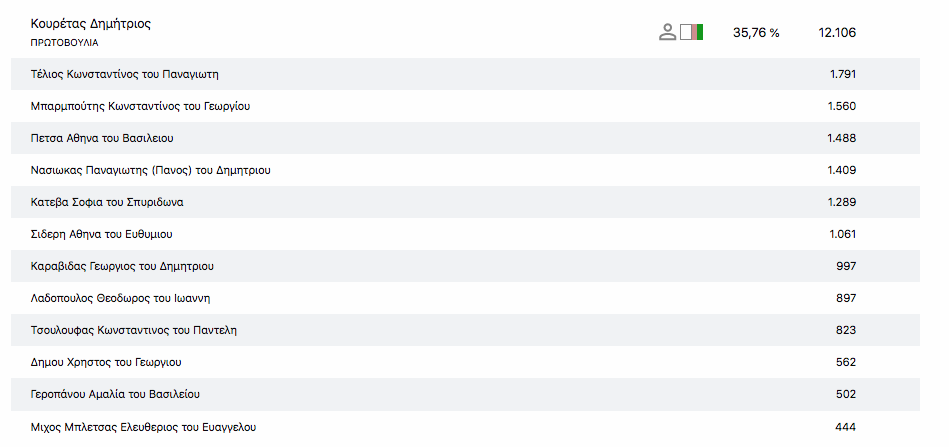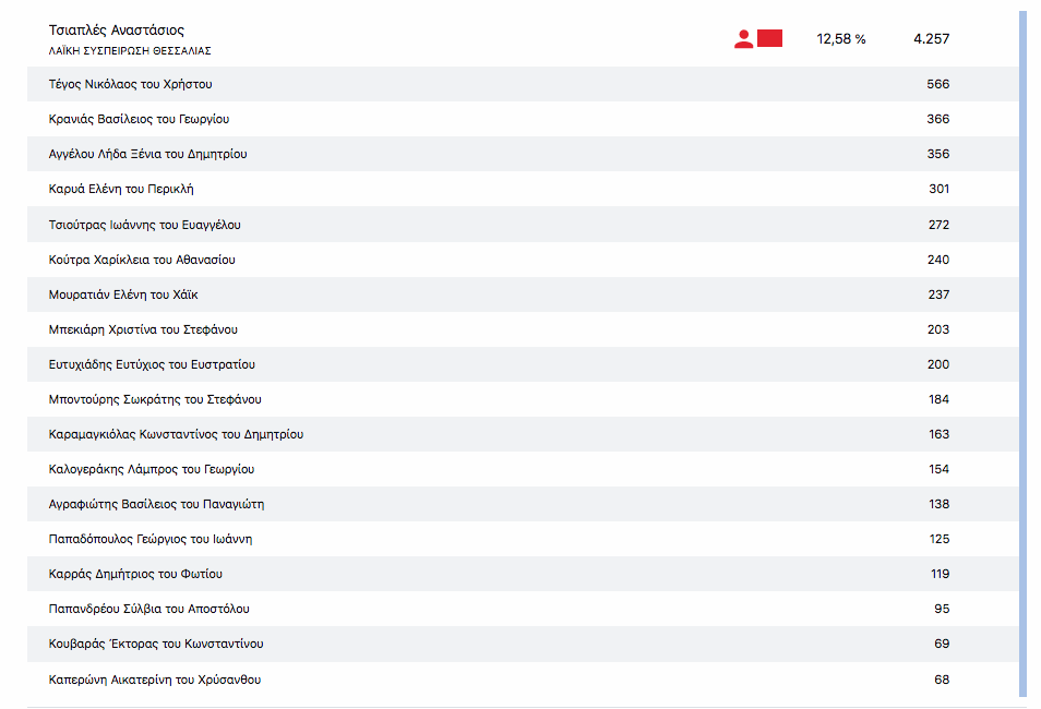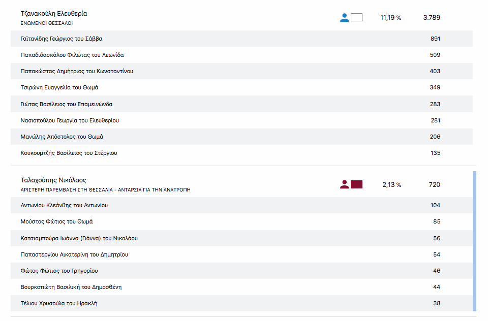 Στο 52% της ενσωμάτωσης των τμημάτων στην Π.Ε. Καρδίτσας η κατάταξη των υποψηφίων Περιφερειακών συμβούλων στο Νομό Καρδίτσας είναι η εξής: