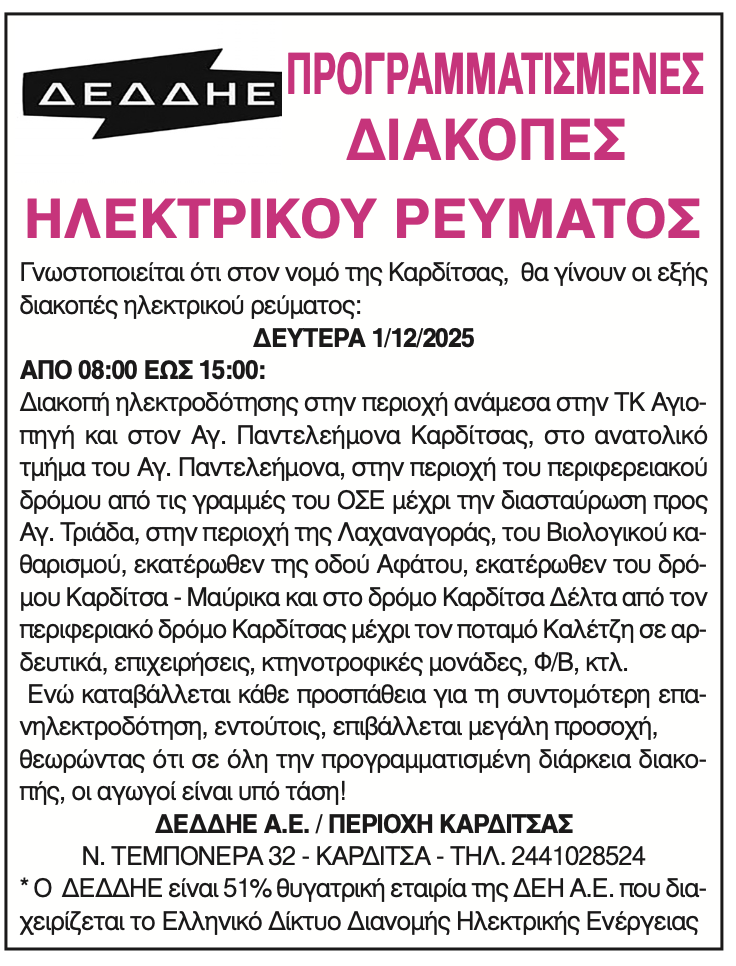 Καρδίτσα Προγραμματισμένες διακοπές ηλεκτρικού ρεύματος 28 Νοεμβρίου 2025, 9:28 πμ FacebookTwitterWhatsAppLinkedin Τελευταίες Ειδήσεις Σήμερα Ακολούθησε την εφημερίδα ΝΕΟΣ ΑΓΩΝ στο Google News! Όλες οι εξελίξεις στην περιοχή της Καρδίτσας και ευρύτερα της Θεσσαλίας