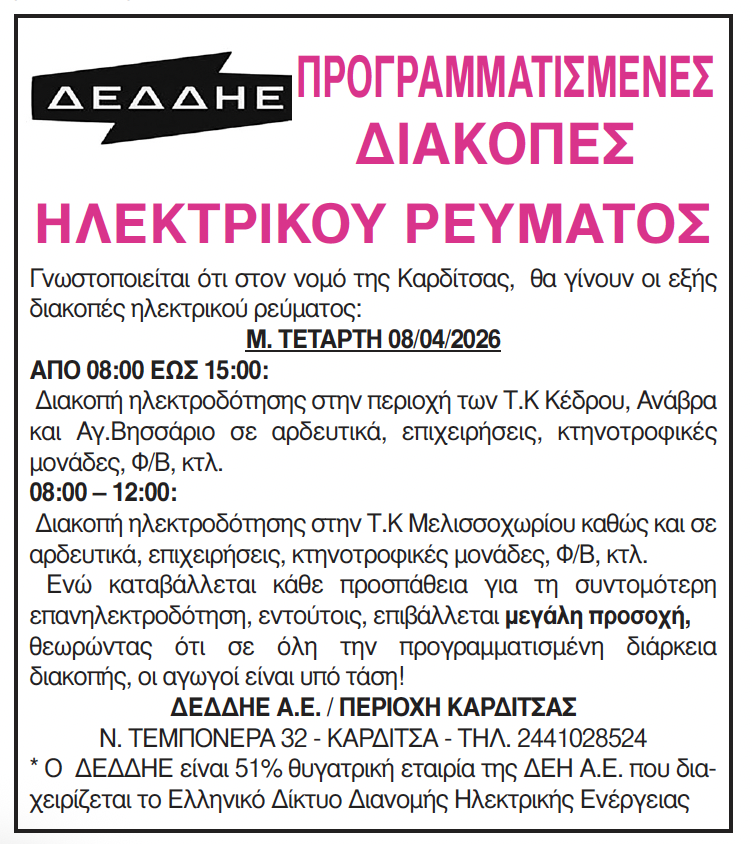 Καρδίτσα Προγραμματισμένες διακοπές ηλεκτρικού ρεύματος 8 Απριλίου 2026, 9:56 πμ FacebookTwitterWhatsAppLinkedin Τελευταίες Ειδήσεις Σήμερα Ακολούθησε την εφημερίδα ΝΕΟΣ ΑΓΩΝ στο Google News! Όλες οι εξελίξεις στην περιοχή της Καρδίτσας και ευρύτερα της Θεσσαλίας