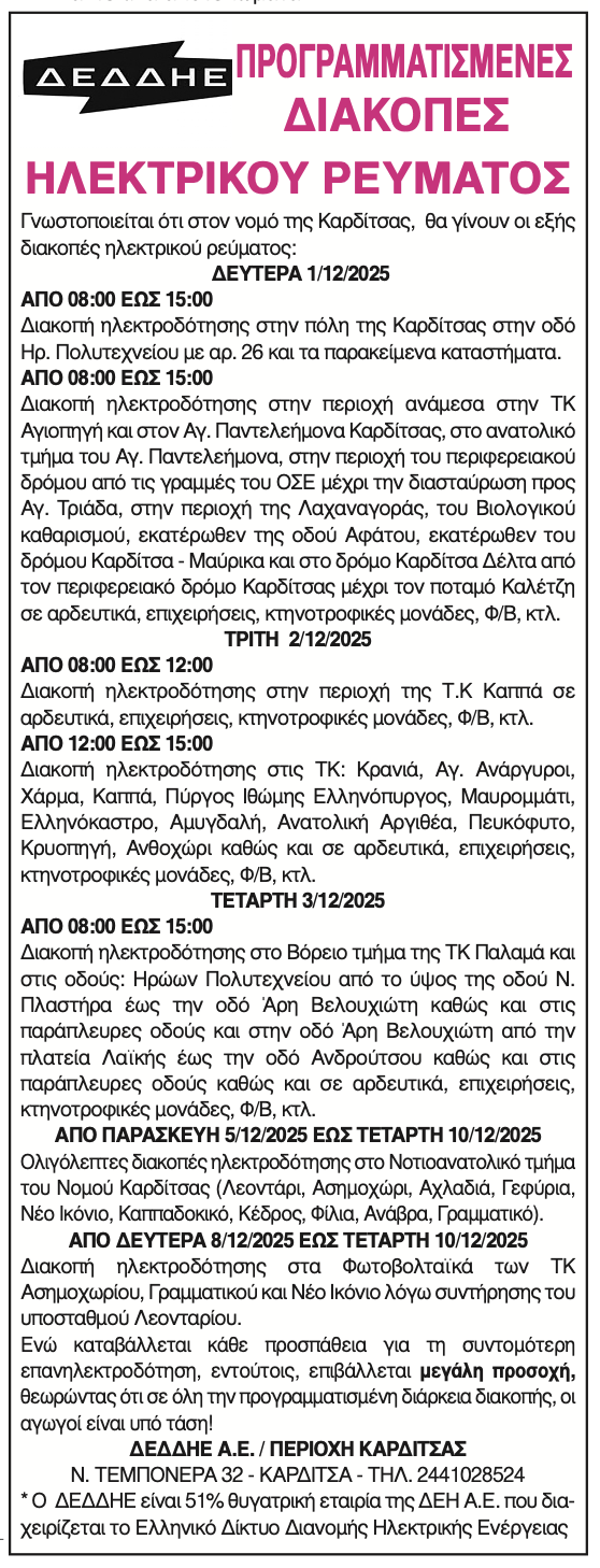 Καρδίτσα Προγραμματισμένες διακοπές ηλεκτρικού ρεύματος στο Ν. Καρδίτσας 29 Νοεμβρίου 2025, 9:27 πμ FacebookTwitterWhatsAppLinkedin Τελευταίες Ειδήσεις Σήμερα Ακολούθησε την εφημερίδα ΝΕΟΣ ΑΓΩΝ στο Google News! Όλες οι εξελίξεις στην περιοχή της Καρδίτσας και ευρύτερα της Θεσσαλίας