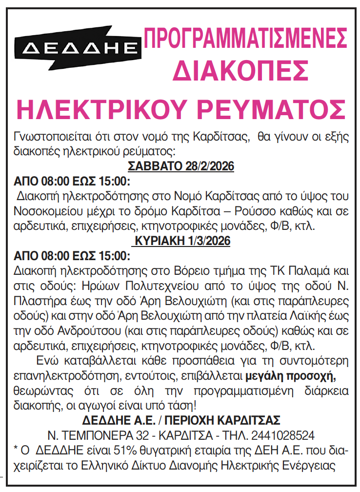Καρδίτσα Προγραμματισμένες διακοπές ηλεκτροδότησης στο Ν. Καρδίτσας 26 Φεβρουαρίου 2026, 9:20 πμ FacebookTwitterWhatsAppLinkedin Τελευταίες Ειδήσεις Σήμερα Ακολούθησε την εφημερίδα ΝΕΟΣ ΑΓΩΝ στο Google News! Όλες οι εξελίξεις στην περιοχή της Καρδίτσας και ευρύτερα της Θεσσαλίας