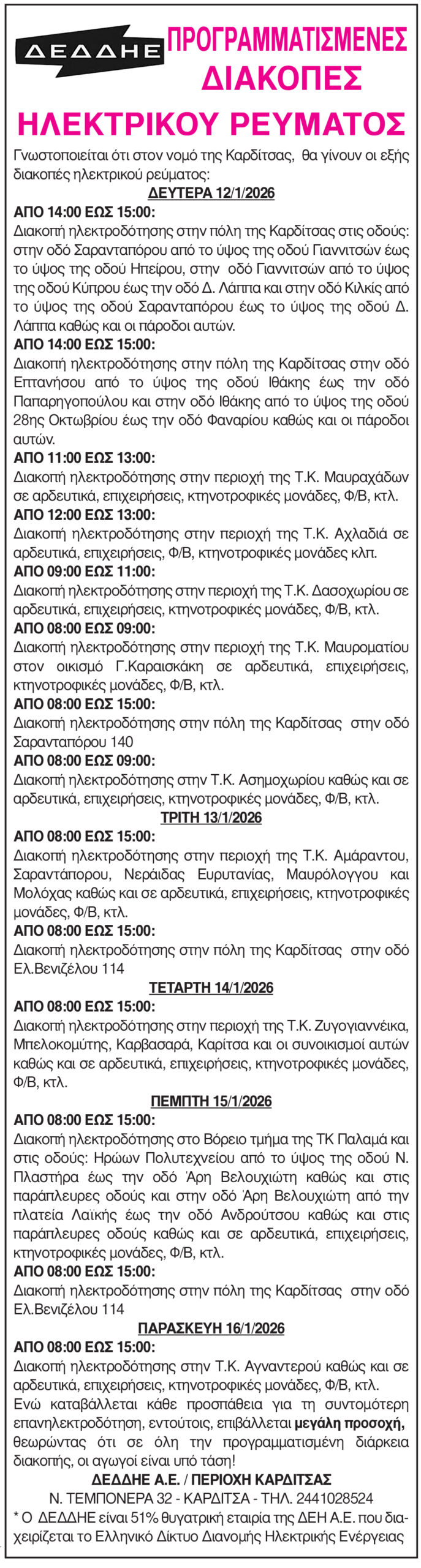 Καρδίτσα Προγραμματισμένες διακοπές ηλεκτροδότησης 10 Ιανουαρίου 2026, 9:01 πμ FacebookTwitterWhatsAppLinkedin Τελευταίες Ειδήσεις Σήμερα Ακολούθησε την εφημερίδα ΝΕΟΣ ΑΓΩΝ στο Google News! Όλες οι εξελίξεις στην περιοχή της Καρδίτσας και ευρύτερα της Θεσσαλίας