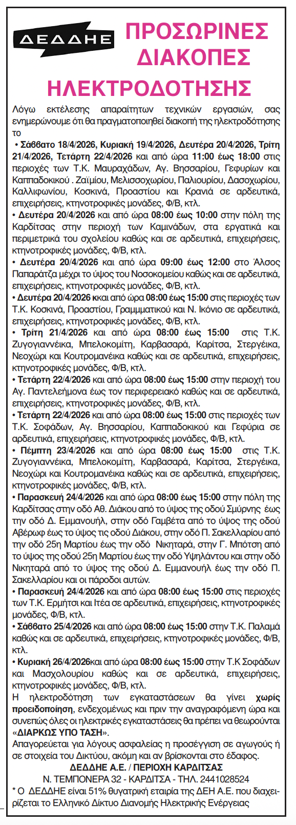 Καρδίτσα Προσωρινές διακοπές ηλεκτροδότησης στο Ν. Καρδίτσας 18 Απριλίου 2026, 9:11 πμ FacebookTwitterWhatsAppLinkedin Τελευταίες Ειδήσεις Σήμερα Ακολούθησε την εφημερίδα ΝΕΟΣ ΑΓΩΝ στο Google News! Όλες οι εξελίξεις στην περιοχή της Καρδίτσας και ευρύτερα της Θεσσαλίας