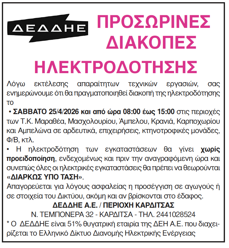 Καρδίτσα Προσωρινές διακοπές ηλεκτροδότησης στο Ν. Καρδίτσας 24 Απριλίου 2026, 10:01 πμ FacebookTwitterWhatsAppLinkedin Τελευταίες Ειδήσεις Σήμερα Ακολούθησε την εφημερίδα ΝΕΟΣ ΑΓΩΝ στο Google News! Όλες οι εξελίξεις στην περιοχή της Καρδίτσας και ευρύτερα της Θεσσαλίας