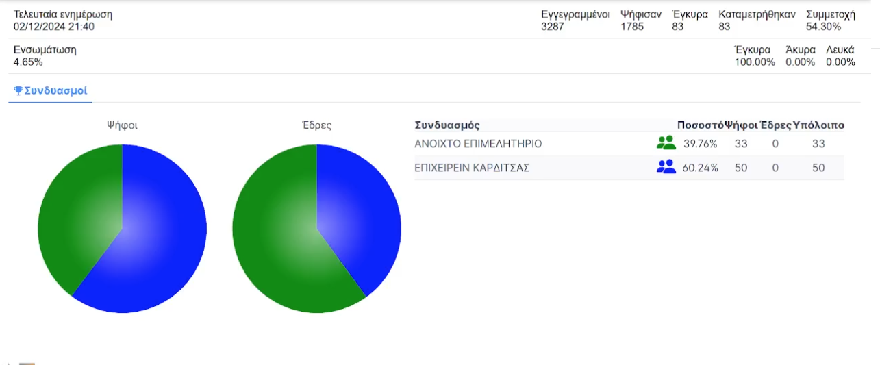 Πρωτα αποτελέσματα στο 4,65% της ενσωμάτωσης στις εκλογές του Επιμελητηρίου, όπως εκδίδονται από την πλατφόρμα του Επιμελητηρίου.