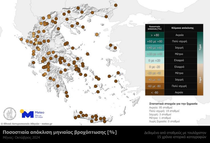 Ακραία συμπεριφορά της ξηρασίας τον Οκτώβριο στη χώρα μας, σύμφωνα με τις καταγραφές 118 σταθμών του δικτύου του Εθνικού Αστεροσκοπείου Αθηνών/meteo.gr οι οποίοι έχουν τουλάχιστον 15 χρόνια λειτουργίας. Ο χάρτης δείχνει την ποσοστιαία απόκλιση του ύψους βροχής τον φετινό Οκτώβριο από την μέση μηνιαία τιμή της τελευταίας 15ετίας.