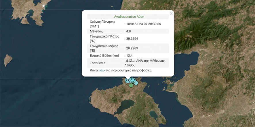 Σεισμός μεγέθους 4,8 βαθμών της Κλίμακας Ρίχτερ καταγράφηκε το πρωί της Τρίτης (10/1) στη Λέσβο.