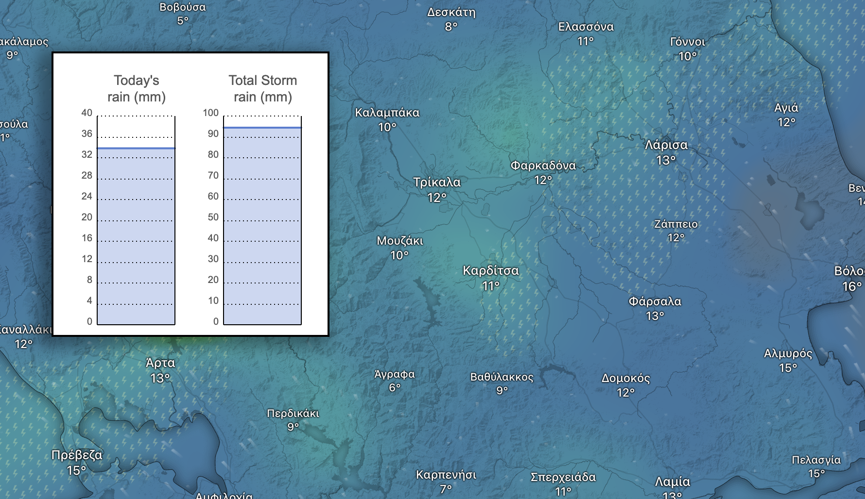 Σύμφωνα με τα μετεωρολογικά δεδομένα από τους σταθμούς του Εθνικού Αστεροσκοπείου, όπως καταγράφει ο ΝΕΟΣ ΑΓΩΝ, στην Καρδίτσα έχουν πέσει από την έναρξη της κακοκαιρίας 20 χιλιοστά βροχής και στο Μουζάκι 46,6. Eπίσης 62,8 στην Κερασιά, 45 στην Πεζούλα 64,8 στην Καστανιά 43,8 ενώ τα μεγαλύτερα ύψη βροχής έχουν καταγραφεί στον Οξυά και είναι 94,4. Προβλήματα πάντως δεν έχουν δημιουργηθεί, ενώ το ζητούμενο είναι με τις βροχοπτώσεις αυτές να εμπλουτιστούν οι ταμιευτήρες.