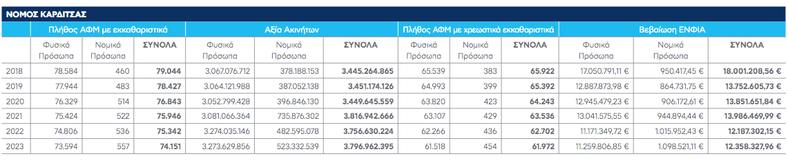 Σε ότι αφορά το Ν. Καρδίτσας, όπως καταγράφει ο Νέος Αγών, η αξία των ακινήτων διαμορφώνεται στα 3,79 δις ευρώ και 74.151 φυσικά και νομικά πρόσωπα θα κληθούν να πληρώσουν ΕΝΦΙΑ αξίας 12,3 εκ ευρώ. Σε σύγκριση με πέρυσι η αξία των ακινήτων αυξήθηκε κατά 40 εκ ευρώ (από 3,75 δις ευρώ σε 3,79 δις ευρώ). Το συνολικό ύψος του ΕΝΦΙΑ που θα κληθούν να καταβάλλουν φυσικά και νομικά πρόσωπα στο Νομό αυξήθηκε επίσης κατά 171.000 ευρώ (από 12,187 εκατ ευρώ σε 12,358 εκατ ευρώ), ενώ αξίζει να σημειωθεί ότι μειώθηκε ο αριθμός των φυσικών προσώπων που θα κληθούν να πληρώσουν το φόρο, ενώ αυξήθηκε εκείνος των νομικών.