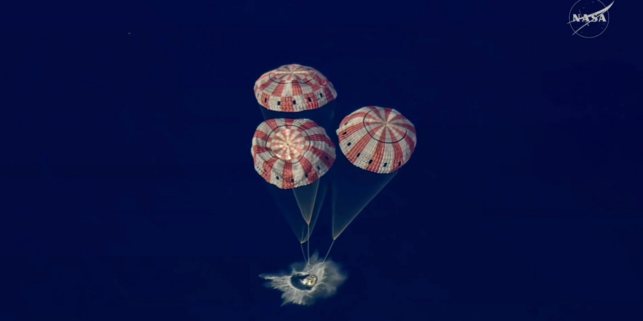 Το σκάφος τους, το Orion, έκανε την είσοδό του την ατμόσφαιρα με ταχύτητα πάνω από 38.000 χιλιόμετρα την ώρα και τις δυνάμεις τριβής να προκαλούν θερμοκρασίες πάνω από τους 2.700° Κελσίου, προτού πάντως προσθαλασσωθεί χωρίς πρόβλημα στον Ειρηνικό, επιβραδυνόμενο από μεγάλα αλεξίπτωτα, όπως ακριβώς την εποχή του προγράμματος Apollo.