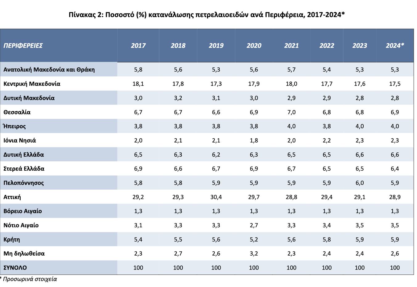 Αύξηση 2,8% στη συνολική κατανάλωση πετρελαιοειδών καταγράφηκε το 2024 σε σχέση με το 2023, με τις αντίστοιχες ποσότητες να ανέρχονται σε 7.029.109 μετρικούς τόνους για το 2024 και 6.837.722 μετρικούς τόνους για το 2023.