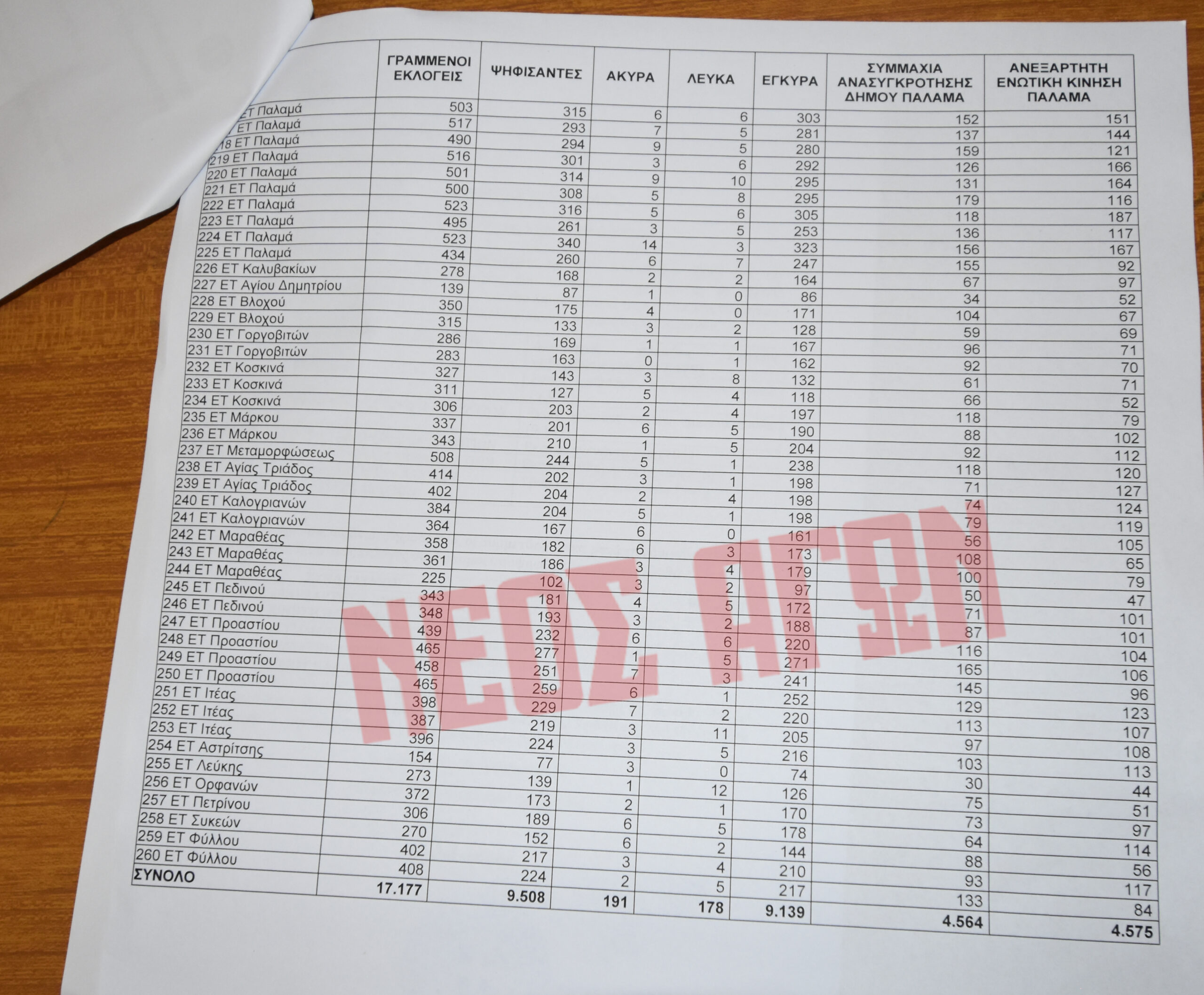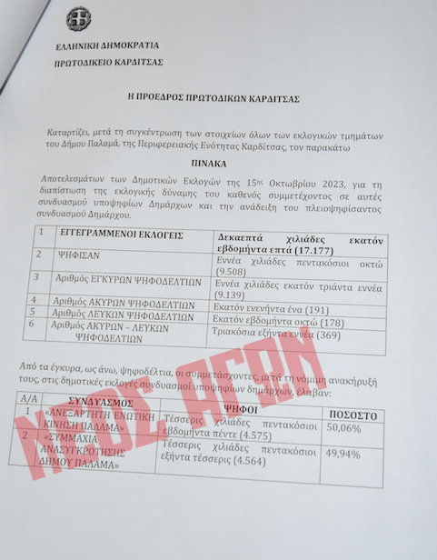 Στην ανάρτηση των αποτελεσμάτων του β’ γύρου των αυτοδιοικητικών εκλογών στο Δήμο Παλαμά προχώρησε σήμερα (17/10) το Πρωτοδικείο Καρδίτσας.