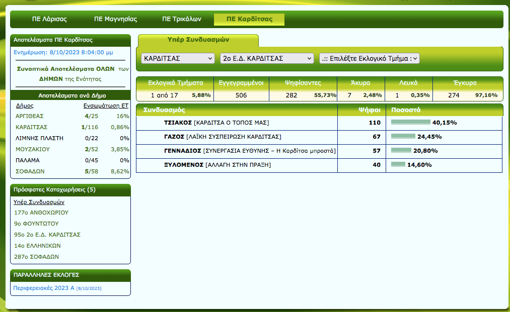 Καρδίτσα Tα αποτελέσματα στο Δήμο Καρδίτσας (ροή) 8 Οκτωβρίου 2023, 8:02 μμ FacebookTwitterWhatsAppLinkedin Τελευταίες Ειδήσεις Σήμερα Ακολούθησε την εφημερίδα ΝΕΟΣ ΑΓΩΝ στο Google News! Όλες οι εξελίξεις στην περιοχή της Καρδίτσας και ευρύτερα της Θεσσαλίας