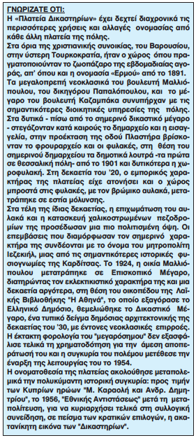 Πιο συγκεκριμένα, δίνεται μια λωρίδα πλάτους 2 μ. έμπροσθεν των καταστημάτων και μια ζώνη βάθους 8μ. σε σχήμα Γ, στην οποία προβλέπεται ενιαία ομοιόμορφη μεταλλική κατασκευή στεγάστρου, με δυνατότητα ανοιγοκλεινόμενης οροφής τμηματικά, με ειδικό πανί αντοχής και σύστημα συγκέντρωσης των όμβριων υδάτων. Το μεταλλικό στέγαστρο θα έχει μορφή μονόκλινη με κλίση 10%, με το ψηλότερο τμήμα του προς το Δικαστικό μέγαρο για τη βέλτιστη θέαση του κτιρίου. Το ύψος του ορίζεται στο χαμηλότερο σημείο να φτάνει στα 3μ. και το ψηλότερο στα 4μ. θα στηρίζεται σε μεταλλικές κολώνες υπενδεδυμένες με τσιμεντοσανίδα και ξύλο και θα φέρουν εσωτερικές υδρορροές, οι οποίες θα καταλήγουν σε κανάλι συλλογής όμβριων υδάτων. Η ανοιγοκλεινόμενη οροφή της θα εξασφαλίζει τόσο σκίαση και προστασία από βροχοπτώσεις, όσο και συνεχή κυκλοφορία του αέρα για λόγους δροσισμού και αερισμού. Πρόκειται δηλαδή για μια μεταλλική ελαφριά κατασκευή, η οποία θα αναβαθμίσει την αισθητική εικόνα των υφιστάμενων διαφορετικών συστημάτων σκίασης, θα λύσει λειτουργικά προβλήματα καίριας σημασίας και ταυτόχρονα θα βοηθήσει την οικονομική ανάπτυξη της περιοχής με τις υπάρχουσες χρήσεις αναψυχής.