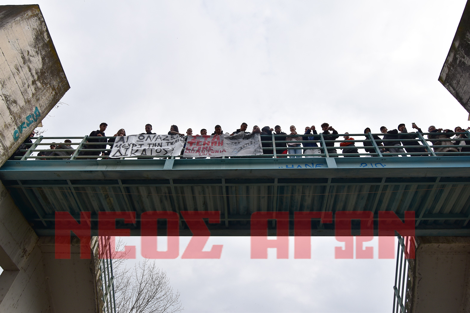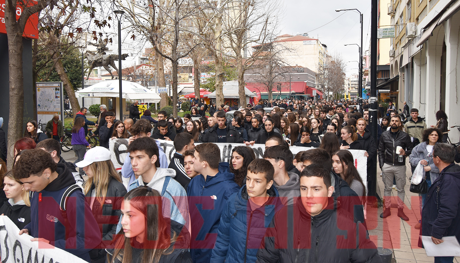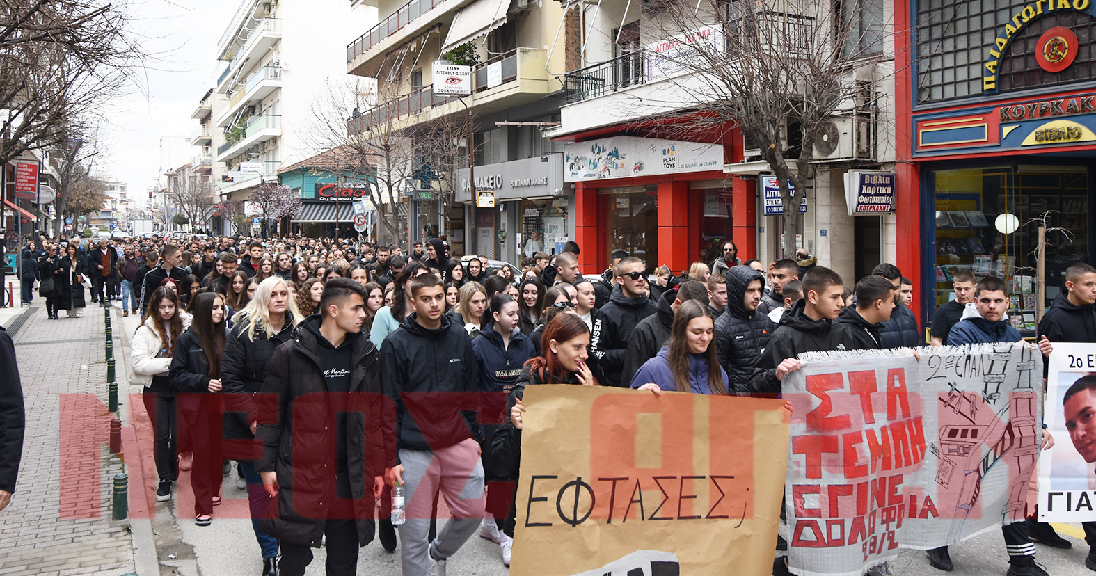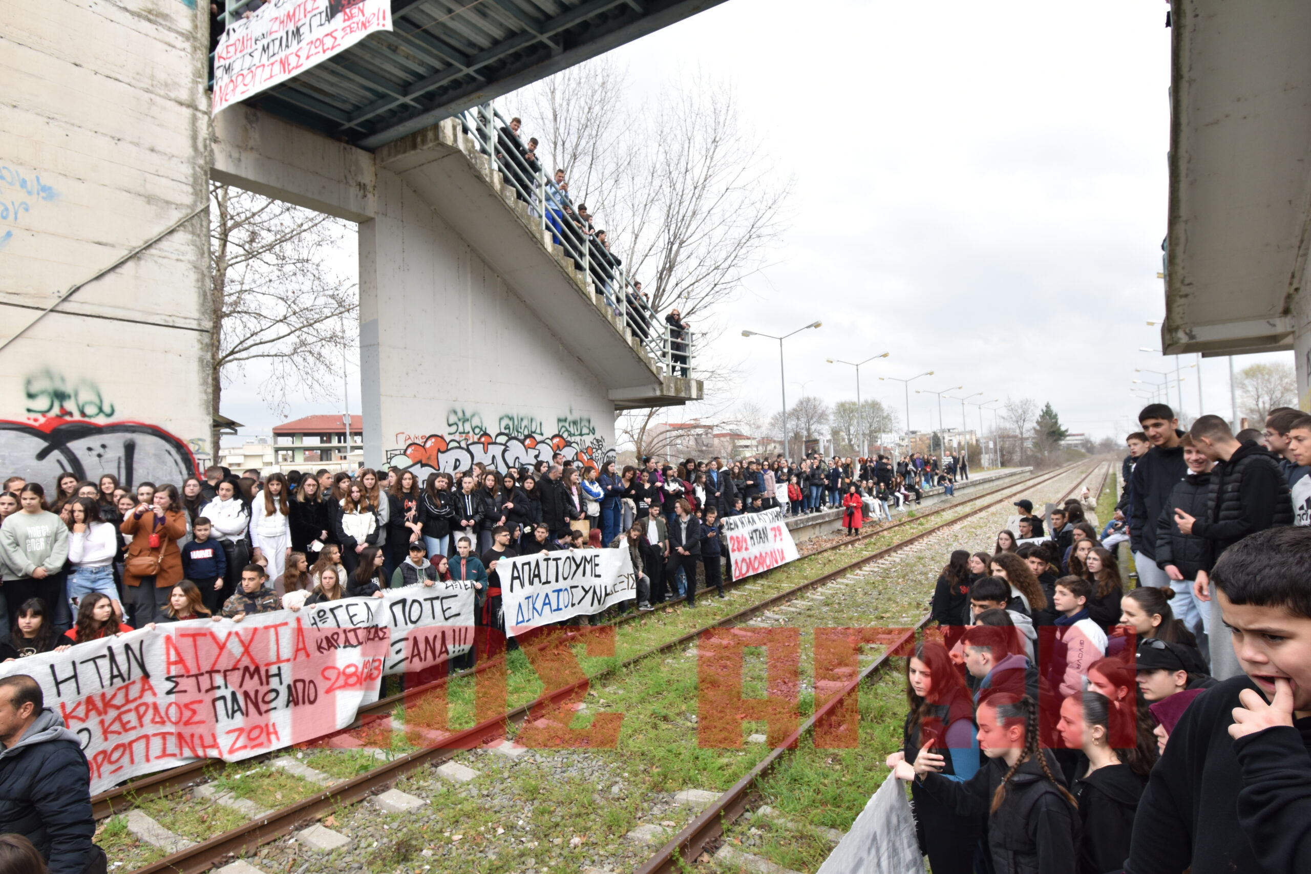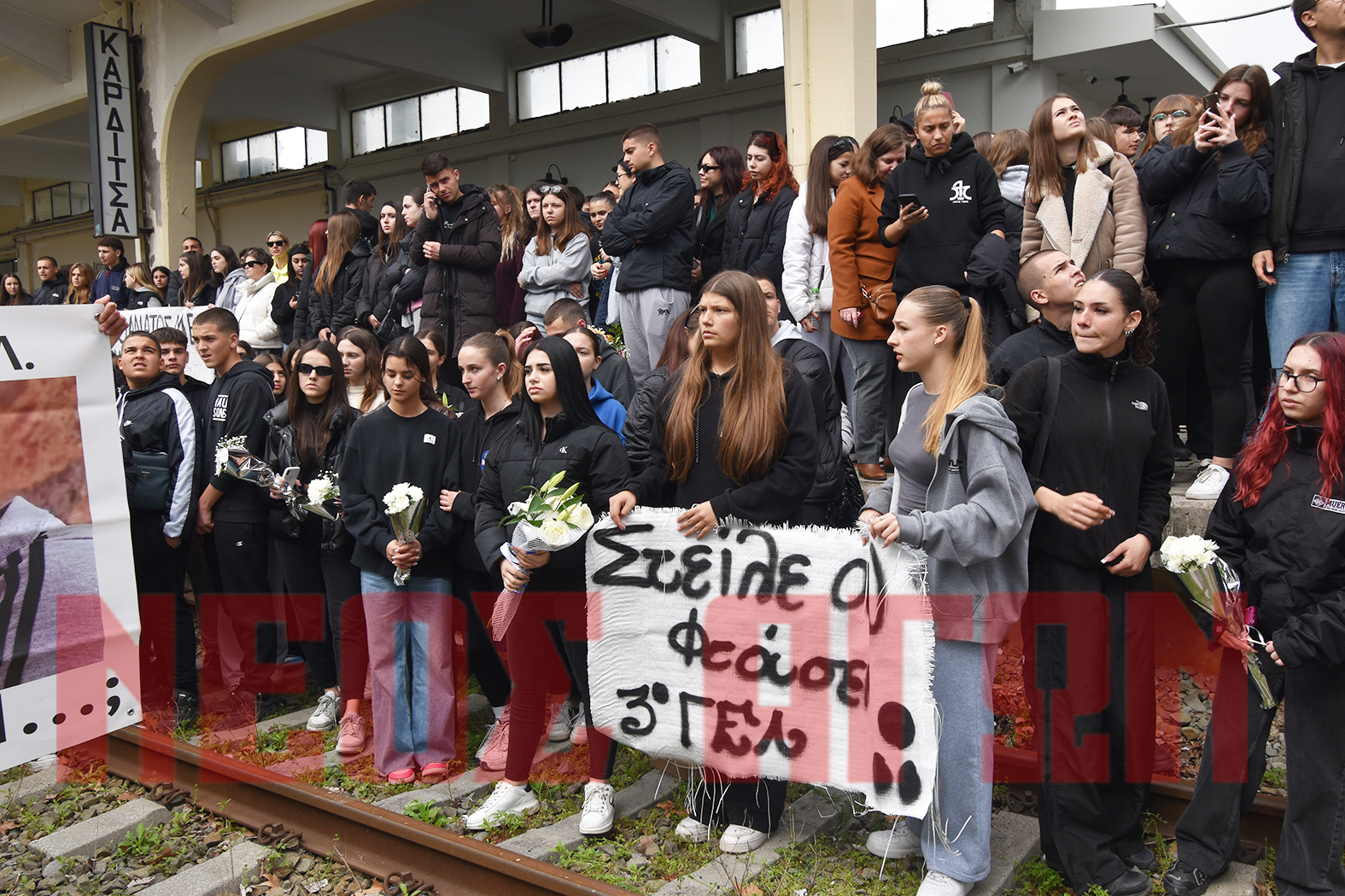 Κόσμος και εργαζόμενοι από τα καταστήματα της οδού Καραϊσκάκη χειροκρότησαν τη μαζική διαδήλωση μαθητών, φοιτητών και εργαζομένων, οι οποίοι με βροντερά συνθήματα έστρεψαν τα βέλη τους σε πολιτικούς υπευθύνους, αλλά και στην απουσία ασφάλειας στα συστήματα του σιδηροδρομικού δικτύου. Στο σιδηροδρομικό Σταθμό, οι μαθητές και φοιτητές τοποθέτησαν συμβολικά λουλούδια στις ράγες, στη μνήμη των θυμάτων των Τεμπών. Ακολούθησε ενός λεπτού σιγή.