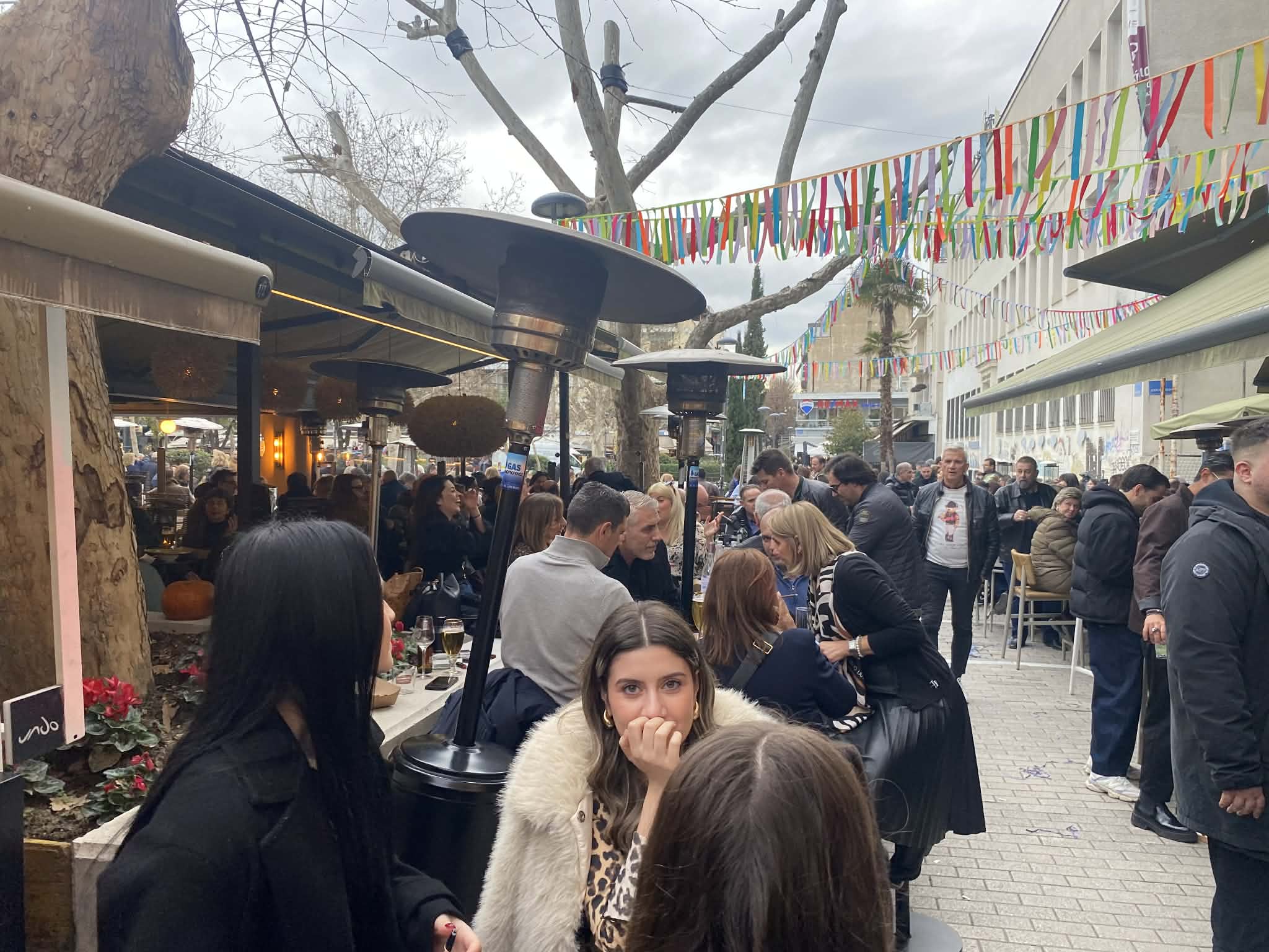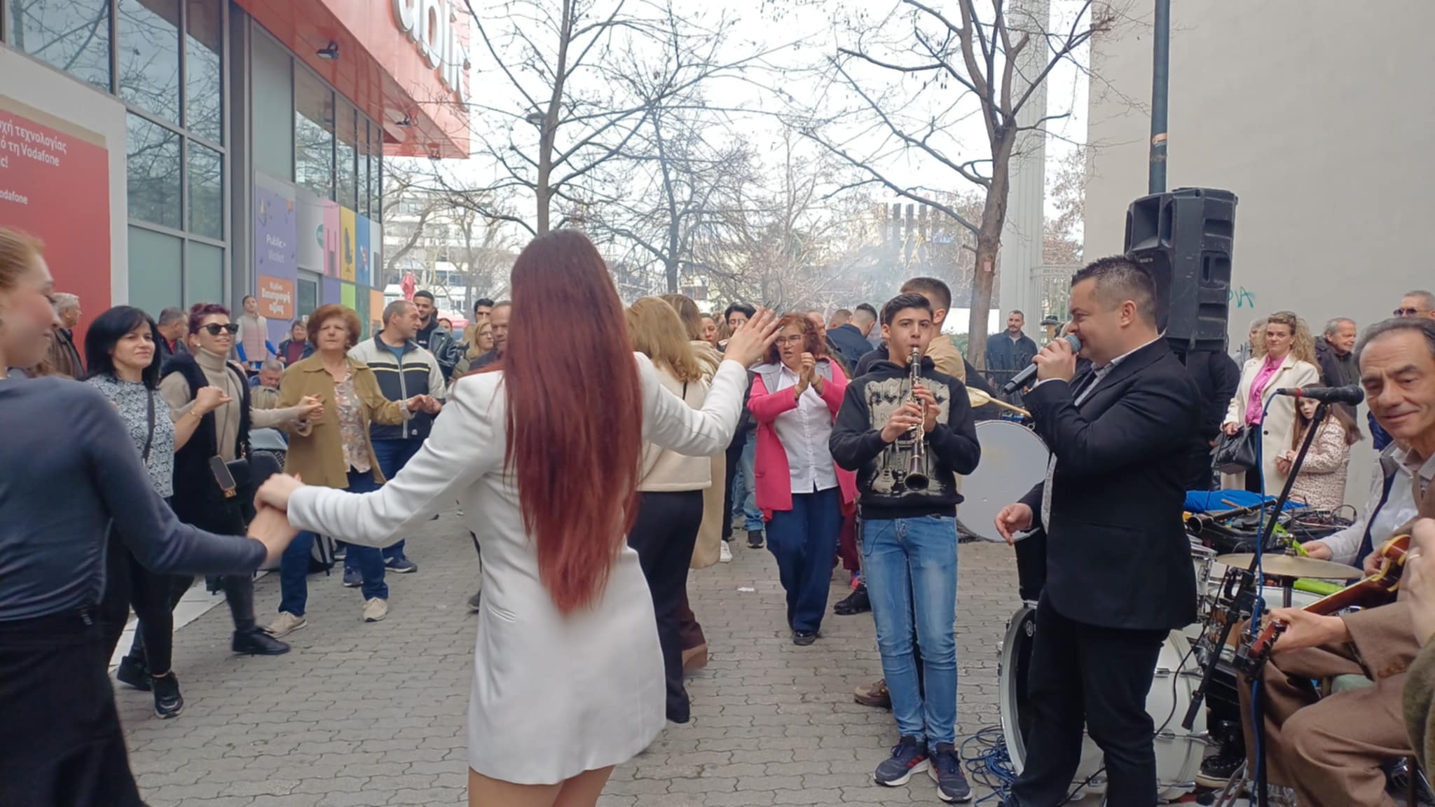 Τσικνοπέμπτη απόγευμα στο κέντρο της Λάρισας και το κέφι ε΄χει ανάψει στα μπαράκια και τις καφετέριες με σουβλάκια και λουκάνικα στις ψησταριές, κρασί και ζωντανές ορχήστρες με χάλκινα και φυσικά χορούς κυκλωτικούς.