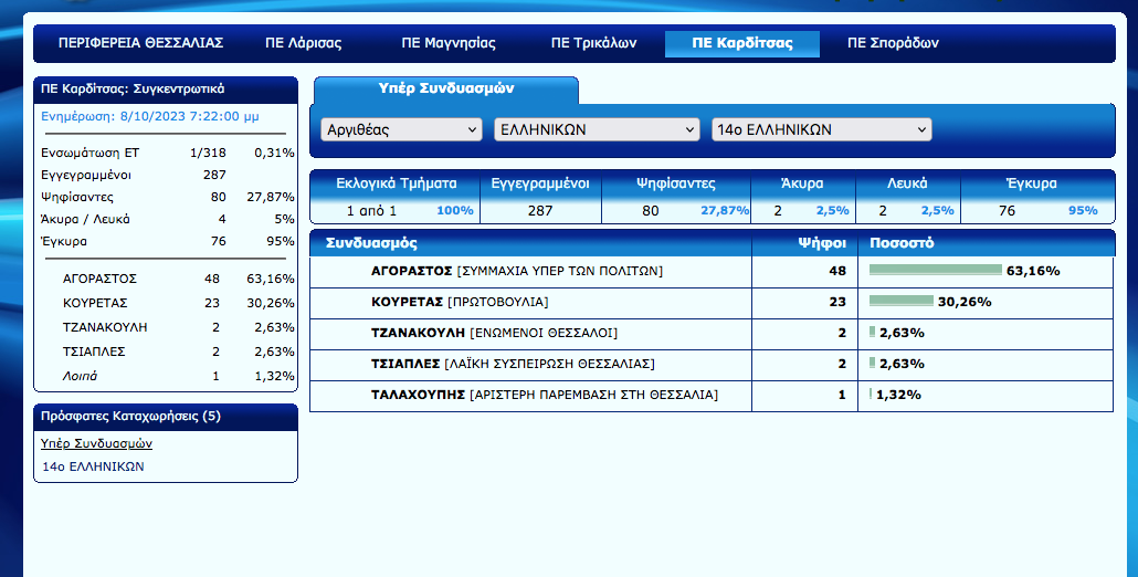 Καρδίτσα To πρώτο αποτέλεσμα σε εκλογικό τμήμα του Ν. Καρδίτσας 8 Οκτωβρίου 2023, 7:23 μμ FacebookTwitterWhatsAppLinkedin Τελευταίες Ειδήσεις Σήμερα Ακολούθησε την εφημερίδα ΝΕΟΣ ΑΓΩΝ στο Google News! Όλες οι εξελίξεις στην περιοχή της Καρδίτσας και ευρύτερα της Θεσσαλίας