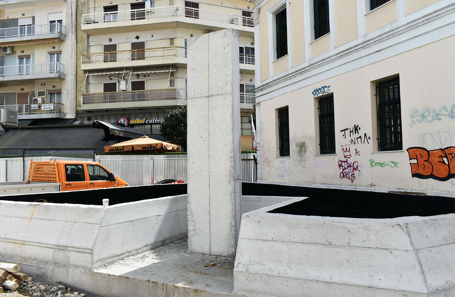 Σε εξέλιξη βρίσκονται οι εργασίες ανάπλασης στην πλατεία Δικαστηρίων. Την περίοδο αυτή ολοκληρώνονται οι τσιμεντένιες κατασκευές για τα παρτέρια και προχωρά η εγκατάσταση του συστήματος για το συντριβάνι ώστε στη συνέχεια να τοποθετηθεί το σύστημα απορροής των υδάτων και ακολούθως να αρχίσουν οι εργασίες στο δάπεδο της πλατείας.
