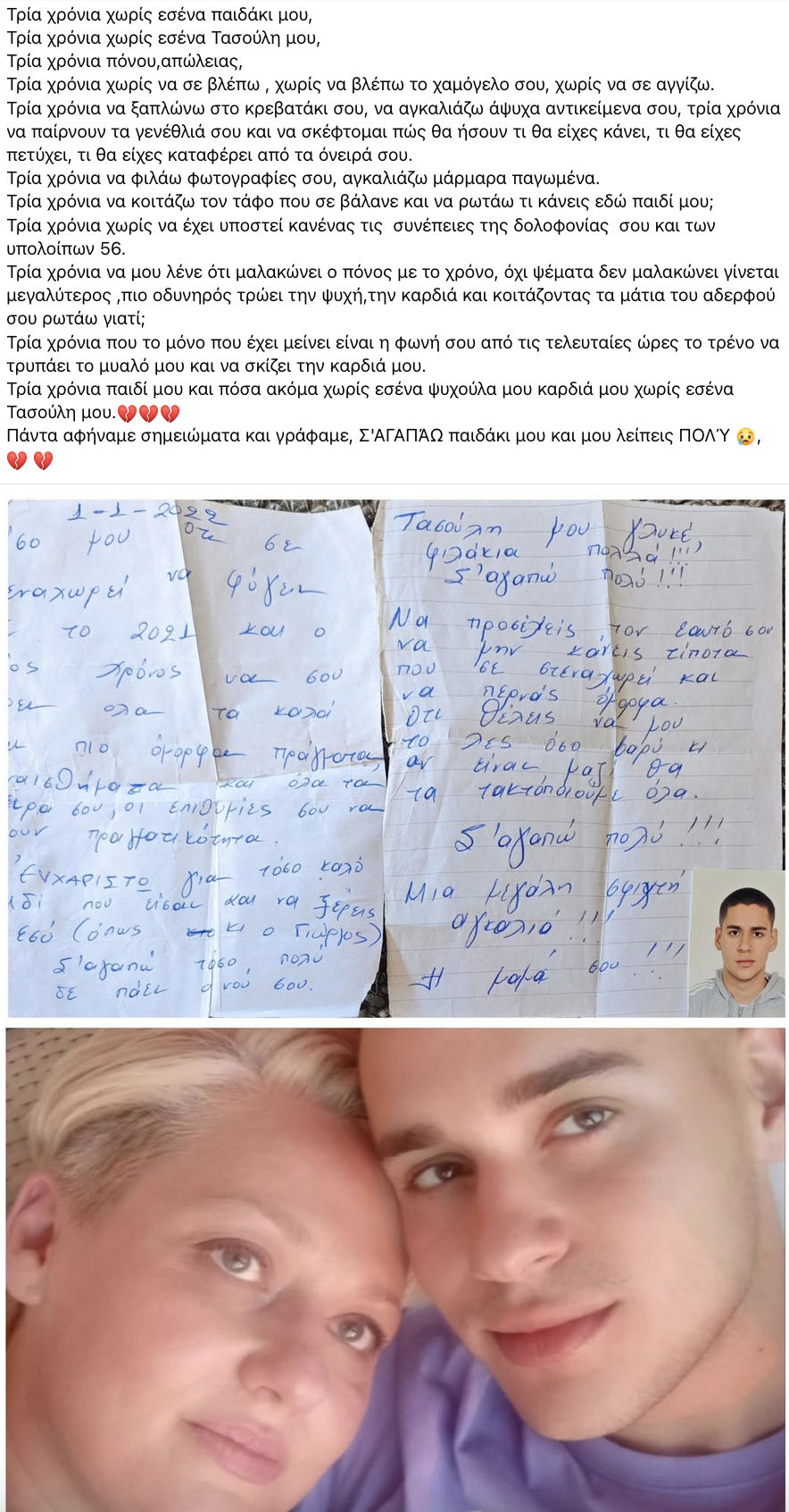 Η μητέρα του αδικοχαμένου Τάσου με ένα συγκινητικό μήνυμα της στο facebook αναφέρεται στα τρία αυτά χρόνια γράφοντας: