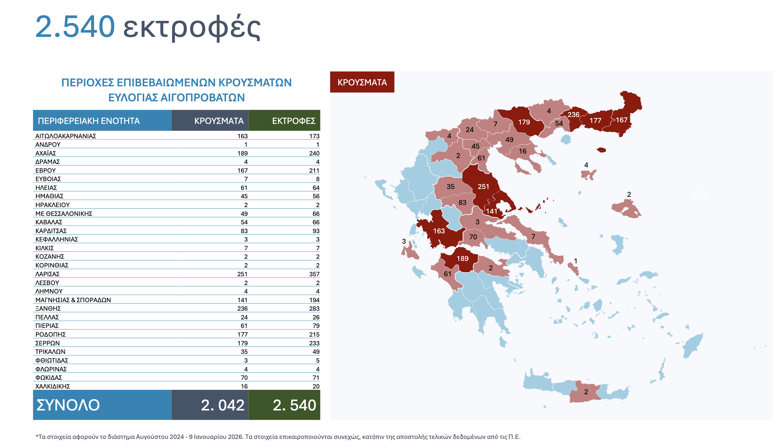 Σύμφωνα με τα στοιχεία, για το διάστημα από τον Αύγουστο 2024 έως και τις 9 Ιανουαρίου 2026: