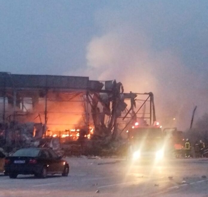Σύμφωνα με την Πυροσβεστική, η φωτιά εκδηλώθηκε λίγο πριν τις 4:00 π.μ. και καίει πτέρυγα του εργοστασίου